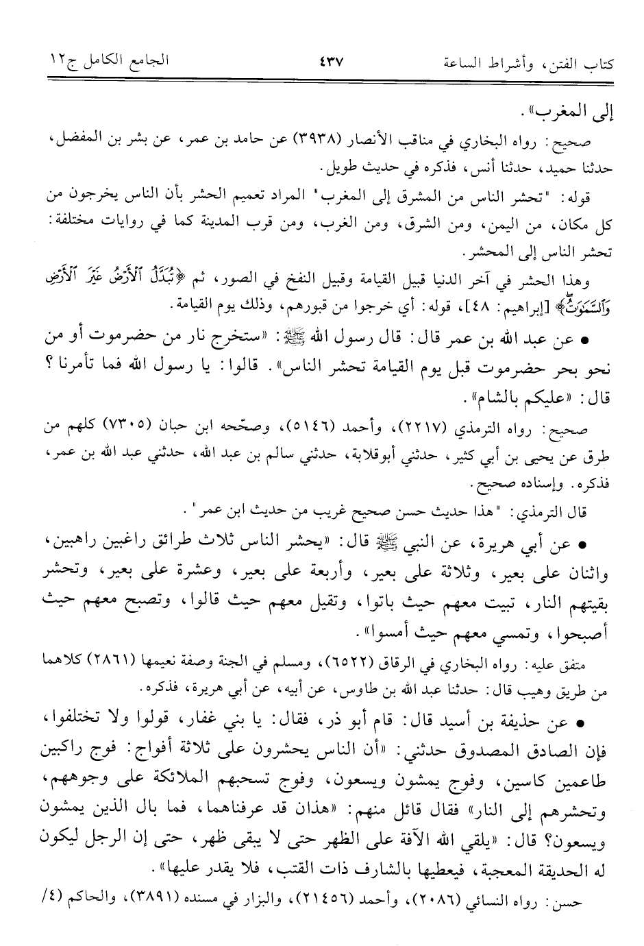 قوله: "تحشر الناس من المشرق إلى المغرب" المراد تعميم الحشر بأن الناس يخرجون من كل مكان، من اليمن، ومن الشرق، ومن الغرب، ومن قرب المدينة كما في روايات مختلفة: تحشر الناس إلى المحشر.