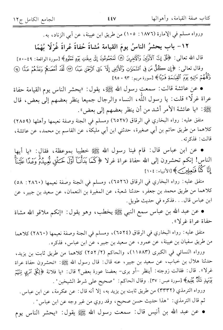 • عن عبد اللَّه بن عباس سمع النبي -صلى اللَّه عليه وسلم- يخطب، وهو يقول: "إنكم ملاقو اللَّه مشاة حفاة عراة غرلا".