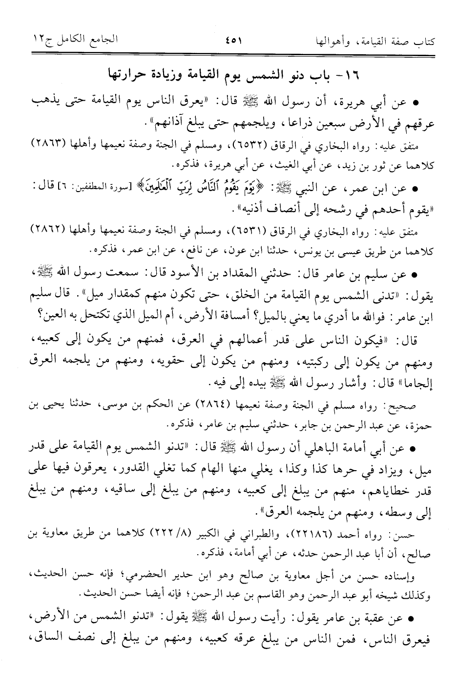 • عن أبي أمامة الباهلي أن رسول اللَّه -صلى اللَّه عليه وسلم- قال: "تدنو الشمس يوم القيامة على قدر ميل، ويزاد في حرها كذا وكذا، يغلي منها الهام كما تغلي القدور، يعرقون فيها على قدر خطاياهم، منهم من يبلغ إلى كعبيه، ومنهم من يبلغ إلى ساقيه، ومنهم من يبلغ إلى وسطه، ومنهم من يلجمه العرق".