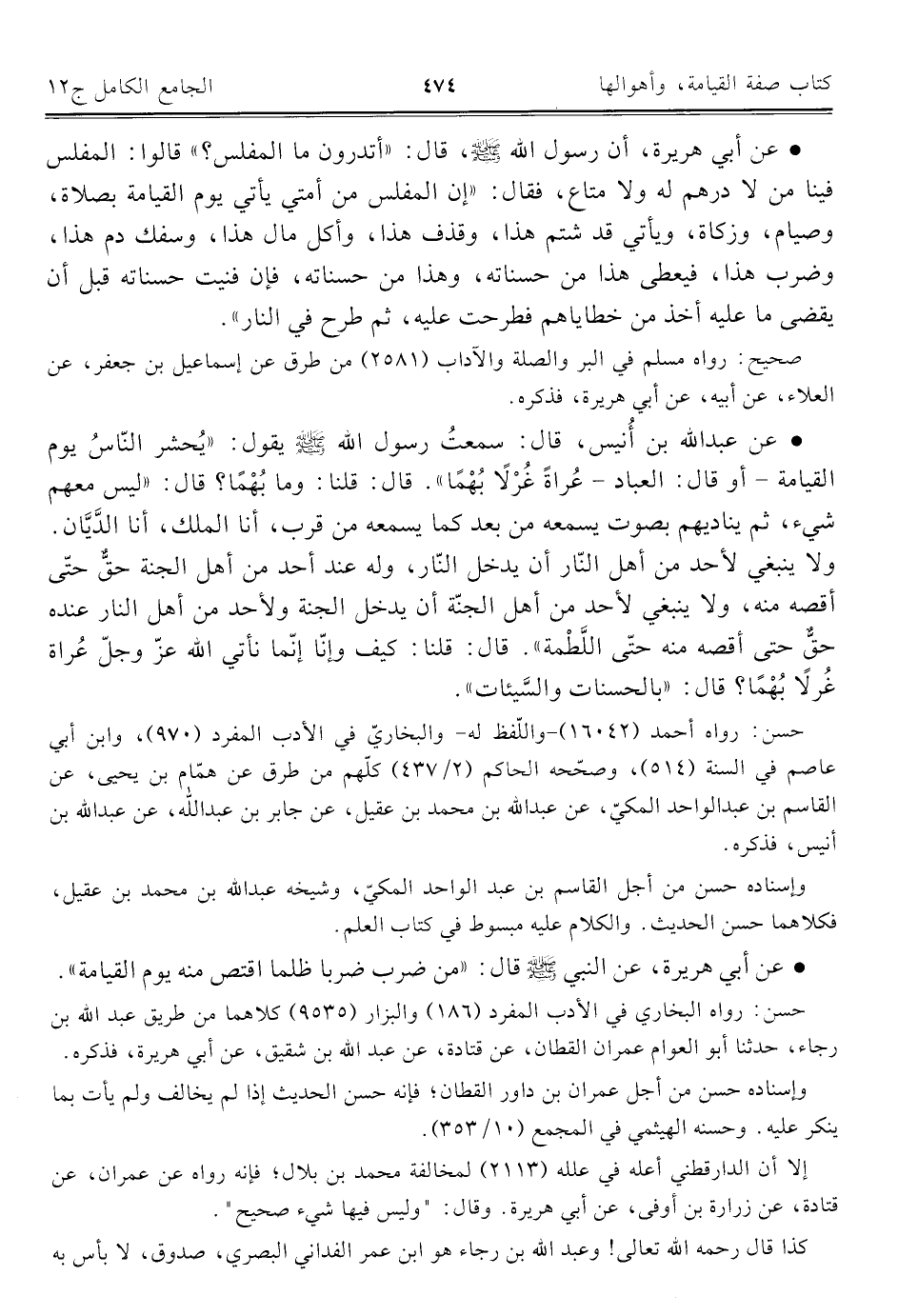 • عن عبد اللَّه بن أُنيس، قال: سمعتُ رسول اللَّه -صلى اللَّه عليه وسلم- يقول: "يُحشر النّاسُ يوم القيامة -أو قال: العباد- عُراةً غُرْلًا بُهْمًا". قال: قلنا: وما بُهْمًا؟ قال: "ليس معهم شيء، ثم يناديهم بصوت يسمعه من بعد كما يسمعه من قرب، أنا الملك، أنا الدَّيَّان. ولا ينبغي لأحد من أهل النّار أن يدخل النّار، وله عند أحد من أهل الجنة حقٌّ حتى أقصه منه، ولا ينبغي لأحد من أهل الجنة أن يدخل الجنة ولأحد من أهل النار عنده حقٌّ حتى أقصه منه حتى اللَّطْمة". قال: قلنا: كيف وإنّا إنما نأتي اللَّه عزّ وجلّ عُراة غُرلًا بُهْمًا؟ قال: "بالحسنات والسَّيئات".