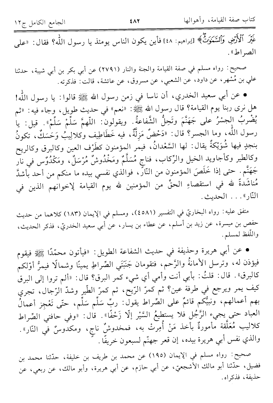 • عن أبي هريرة وحذيفة في حديث الشّفاعة الطويل: "فيأتون محمّدًا -صلى اللَّه عليه وسلم- فيقوم فيؤذن له، وترسل الأمانةُ والرَّحم، فتقومان جَنَبَتَي الصِّراطِ يمينًا وشمالًا فيمرُّ أوّلكم كالبرق". قال: قلتُ: بأبي أنت وأمي أي شيء كمر البرق؟ قال: "ألم تروا إلى البرق كيف يمر ويرجع في طرفة عين؟ ثم كمرّ الرّيح، ثم كمرّ الطّير وشدّ الرّجال، تجري بهم أعمالهم، ونبيُّكم قائمٌ على الصِّراط يقول: ربِّ سَلِّم سَلِّم، حتى تَعْجِز أعمالُ العباد حتى يجيء الرَّجُل فلا يستطيعُ السَّيْر إلّا زَحْفًا". قال: "وفي حافتي الصِّراط كلاليب مُعَلَّقة مأمورةٌ بأخذ مَنْ أُمِرتْ به، فمخدوشٌ ناجٍ، ومكدوسٌ في النّار". والذي نفس أبي هريرة بيده، إن قعر جهنّم لسبعون خريفًا.