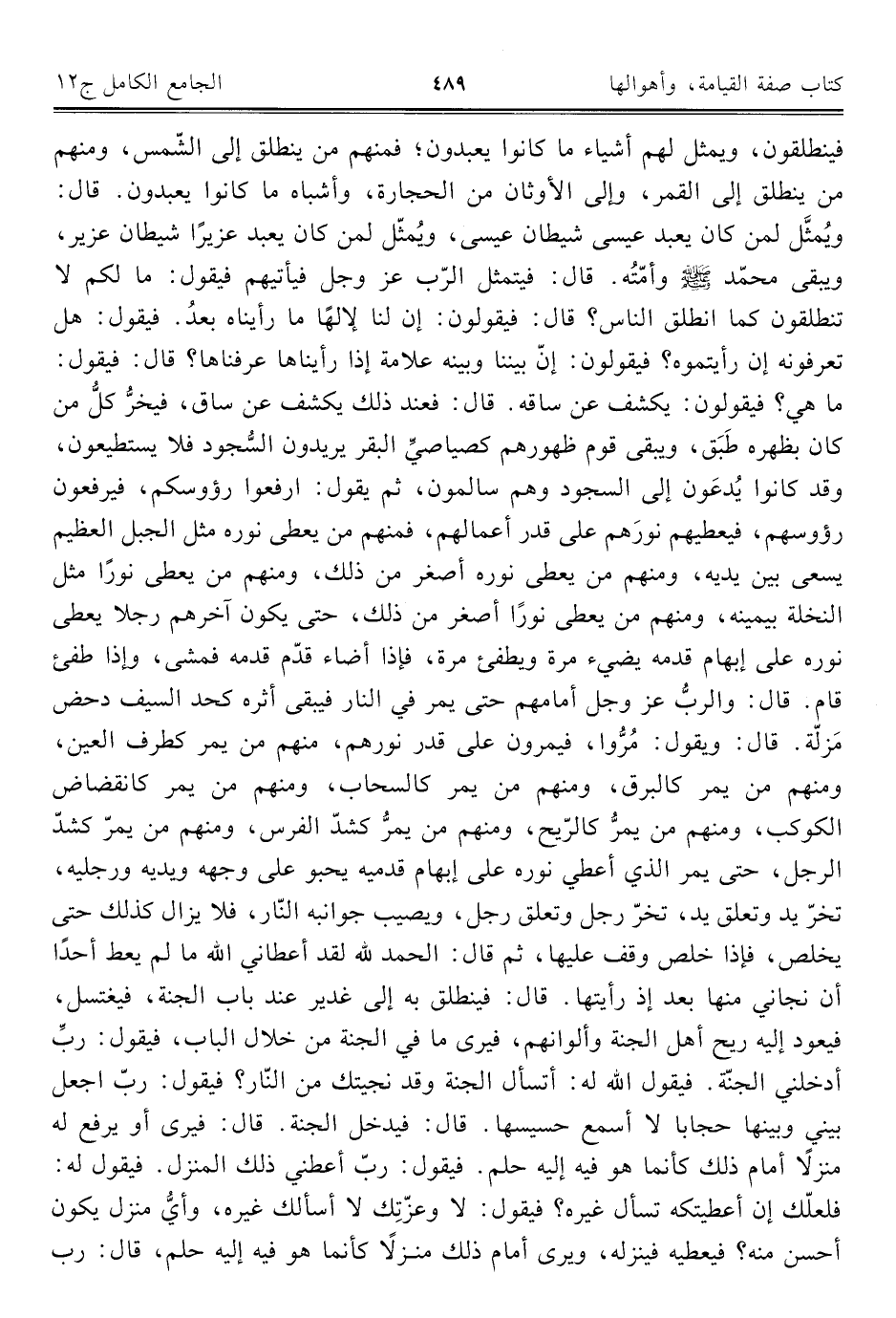 فينطلقون، ويمثل لهم أشياء ما كانوا يعبدون؛ فمنهم من ينطلق إلى الشّمس، ومنهم من ينطلق إلى القمر، وإلى الأوثان من الحجارة، وأشباه ما كانوا يعبدون. قال: ويُمثَّل لمن كان يعبد عيسى شيطان عيسى، ويُمثّل لمن كان يعبد عزيرًا شيطان عزير، ويبقى محمّد -صلى اللَّه عليه وسلم- وأمّتُه. قال: فيتمثل الرّب عز وجل فيأتيهم فيقول: ما لكم لا تنطلقون كما انطلق الناس؟ قال: فيقولون: إن لنا لإلهًا ما رأيناه بعدُ. فيقول: هل تعرفونه إن رأيتموه؟ فيقولون: إنّ بيننا وبينه علامة إذا رأيناها عرفناها؟ قال: فيقول: ما هي؟ فيقولون: يكشف عن ساقه. قال: فعند ذلك يكشف عن ساق، فيخرُّ كلُّ من كان بظهره طَبَق، ويبقى قوم ظهورهم كصياصيِّ البقر يريدون السُّجود فلا يستطيعون، وقد كانوا يُدعَون إلى السجود وهم سالمون، ثم يقول: ارفعوا رؤوسكم، فيرفعون رؤوسهم، فيعطيهم نورَهم على قدر أعمالهم، فمنهم من يعطى نوره مثل الجبل العظيم يسعى بين يديه، ومنهم من يعطى نوره أصغر من ذلك، ومنهم من يعطى نورًا مثل النخلة بيمينه، ومنهم من يعطى نورًا أصغر من ذلك، حتى يكون آخرهم رجلا يعطى نوره على إبهام قدمه يضيء مرة ويطفئ مرة، فإذا أضاء قدّم قدمه فمشى، وإذا طفئ قام. قال: والربُّ عز وجل أمامهم حتى يمر في النار فيبقى أثره كحد السيف دحض مَزلّة. قال: ويقول: مُرُّوا، فيمرون على قدر نورهم، منهم من يمر كطرف العين، ومنهم من يمر كالبرق، ومنهم من يمر كالسحاب، ومنهم من يمر كانقضاض الكوكب، ومنهم من يمرُّ كالرّيح، ومنهم من يمرُّ كشدّ الفرس، ومنهم من يمرّ كشدّ الرجل، حتى يمر الذي أعطي نوره على إبهام قدميه يحبو على وجهه ويديه ورجليه، تخرّ يد وتعلق يد، تخرّ رجل وتعلق رجل، ويصيب جوانبه النّار، فلا يزال كذلك حتى يخلص، فإذا خلص وقف عليها، ثم قال: الحمد للَّه لقد أعطاني اللَّه ما لم يعط أحدًا أن نجاني منها بعد إذ رأيتها. قال: فينطلق به إلى غدير عند باب الجنة، فيغتسل، فيعود إليه ريح أهل الجنة وألوانهم، فيرى ما في الجنة من خلال الباب، فيقول: ربِّ أدخلني الجنة. فيقول اللَّه له: أتسأل الجنة وقد نجيتك من النّار؟ فيقول: رب اجعل بيني وبينها حجابا لا أسمع حسيسها. قال: فيدخل الجنة. قال: فيرى أو يرفع له منزلًا أمام ذلك كأنما هو فيه إليه حلم. فيقول: ربّ أعطني ذلك المنزل. فيقول له: فلعلّك إن أعطيتكه تسأل غيره؟ فيقول: لا وعزّتِك لا أسألك غيره، وأيُّ منزل يكون أحسن منه؟ فيعطيه فينزله، ويرى أمام ذلك منزلًا كأنما هو فيه إليه حلم، قال: رب