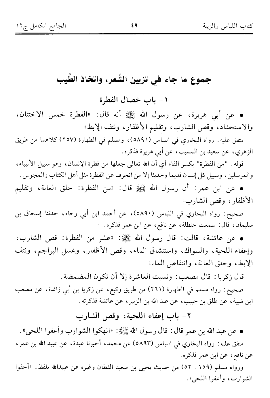 • عن أبى هريرة، عن رسول اللَّه -صلى اللَّه عليه وسلم- أنه قال: "الفطرة خمس الاختتان، والاستحداد، وقص الشارب، وتقليم الأظفار، ونتف الإبط"