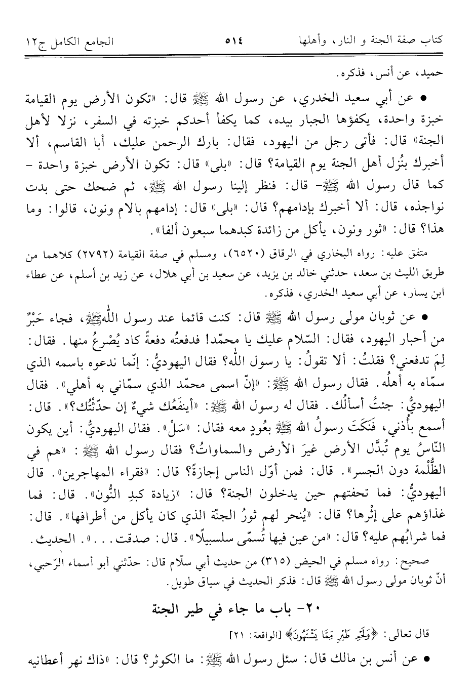• عن أبي سعيد الخدري، عن رسول اللَّه -صلى اللَّه عليه وسلم- قال: "تكون الأرض يوم القيامة خبزة واحدة، يكفؤها الجبار بيده، كما يكفأ أحدكم خبزته في السفر، نزلا لأهل الجنة" قال: فأتى رجل من اليهود، فقال: بارك الرحمن عليك، أبا القاسم، ألا أخبرك بنُزل أهل الجنة يوم القيامة؟ قال: "بلى" قال: تكون الأرض خبزة واحدة -كما قال رسول اللَّه -صلى اللَّه عليه وسلم- قال: فنظر إلينا رسول اللَّه -صلى اللَّه عليه وسلم-، ثم ضحك حتى بدت نواجذه، قال: ألا أخبرك بإدامهم؟ قال: "بلى" قال: إدامهم بالام ونون، قالوا: وما هذا؟ قال: "ثور ونون، يأكل من زائدة كبدهما سبعون ألفا".