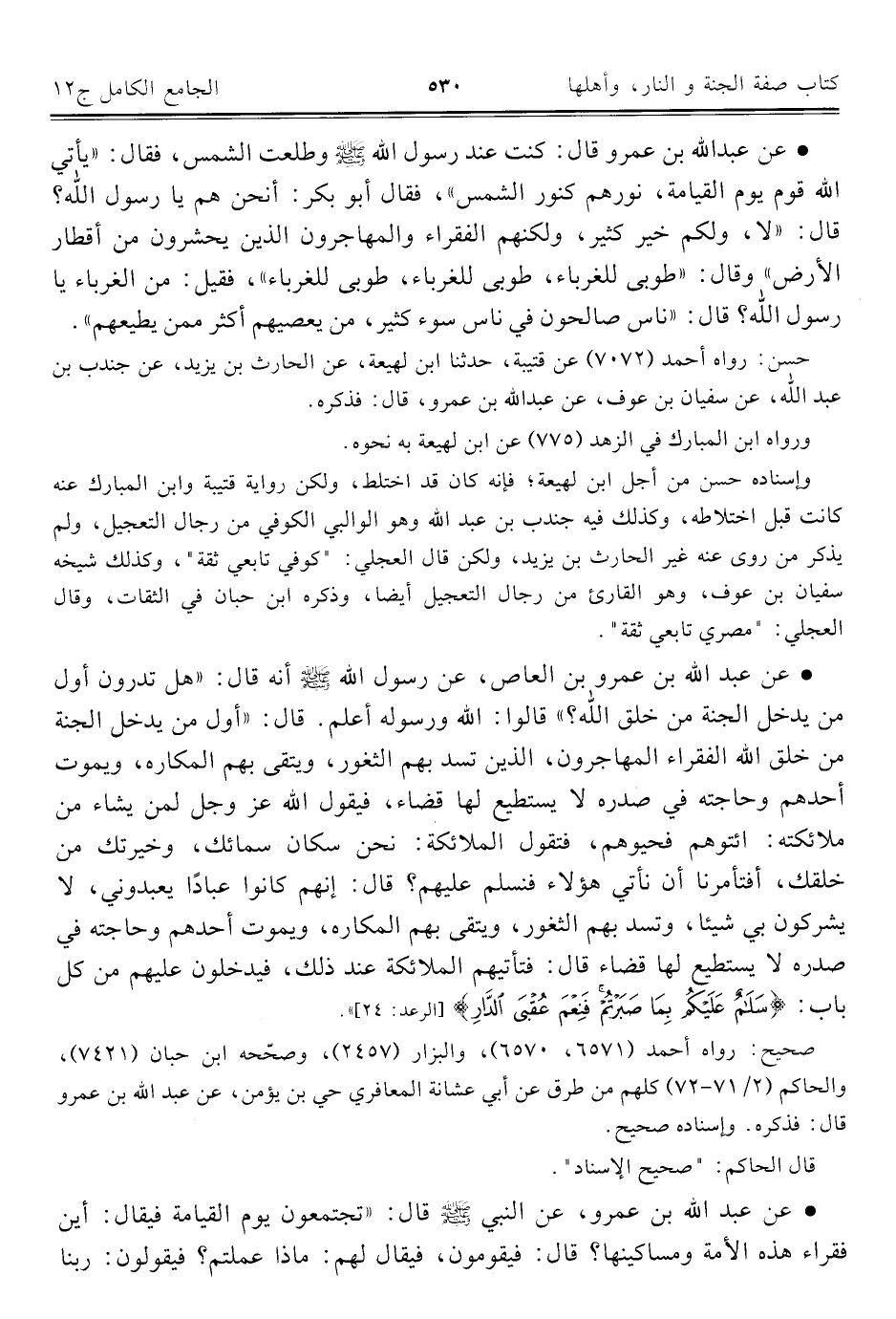 • عن عبد اللَّه بن عمرو قال: كنت عند رسول اللَّه -صلى اللَّه عليه وسلم- وطلعت الشمس، فقال: "يأتي اللَّه قوم يوم القيامة، نورهم كنور الشمس"، فقال أبو بكر: أنحن هم يا رسول اللَّه؟ قال: "لا، ولكم خير كثير، ولكنهم الفقراء والمهاجرون الذين يحشرون من أقطار الأرض" وقال: "طوبى للغرباء، طوبى للغرباء، طوبى للغرباء"، فقيل: من الغرباء يا رسول اللَّه؟ قال: "ناس صالحون في ناس سوء كثير، من يعصيهم أكثر ممن يطيعهم".