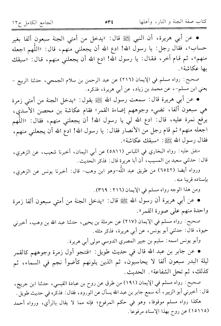 • عن أبي هريرة أن رسول اللَّه -صلى اللَّه عليه وسلم- قال: "يدخل الجنة من أمتي سبعون ألفا زمرة واحدة منهم على صورة القمر".