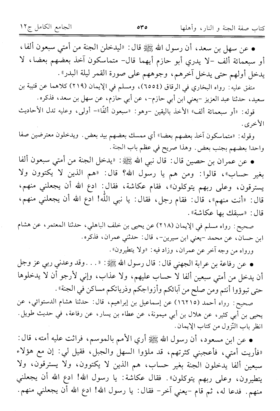 • عن ابن مسعود، أن رسول اللَّه -صلى اللَّه عليه وسلم- أري الأمم بالموسم، فراثت عليه أمته، قال: "فأريت أمتي، فأعجبني كثرتهم، قد ملؤوا السهل والجبل، فقيل لي: إن مع هؤلاء سبعين ألفا يدخلون الجنة بغير حساب، هم الذين لا يكتوون، ولا يسترقون، ولا يتطيرون، وعلى ربهم يتوكلون". فقال عكاشة: يا رسول اللَّه! ادع اللَّه أن يجعلني منهم. فدعا له، ثم قام -يعني آخر- فقال: يا رسول اللَّه! ادع اللَّه أن يجعلني منهم.