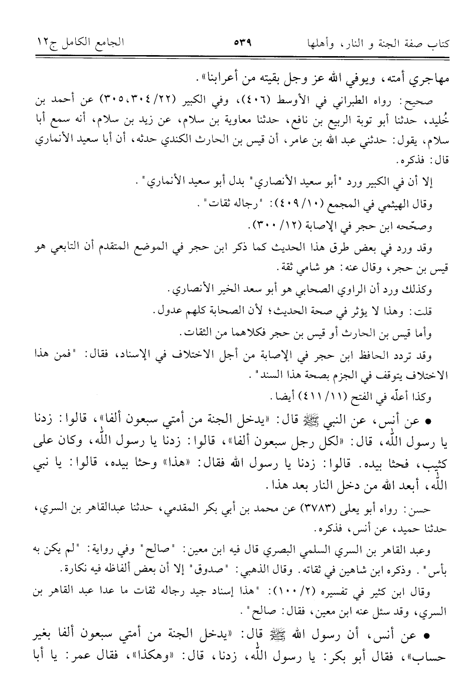 • عن أنس، عن النبي -صلى اللَّه عليه وسلم- قال: "يدخل الجنة من أمتي سبعون ألفا"، قالوا: زدنا يا رسول اللَّه، قال: "لكل رجل سبعون ألفا"، قالوا: زدنا يا رسول اللَّه، وكان على كثيب، فحثا بيده. قالوا: زدنا يا رسول اللَّه فقال: "هذا" وحثا بيده، قالوا: يا نبي اللَّه، أبعد اللَّه من دخل النار بعد هذا.