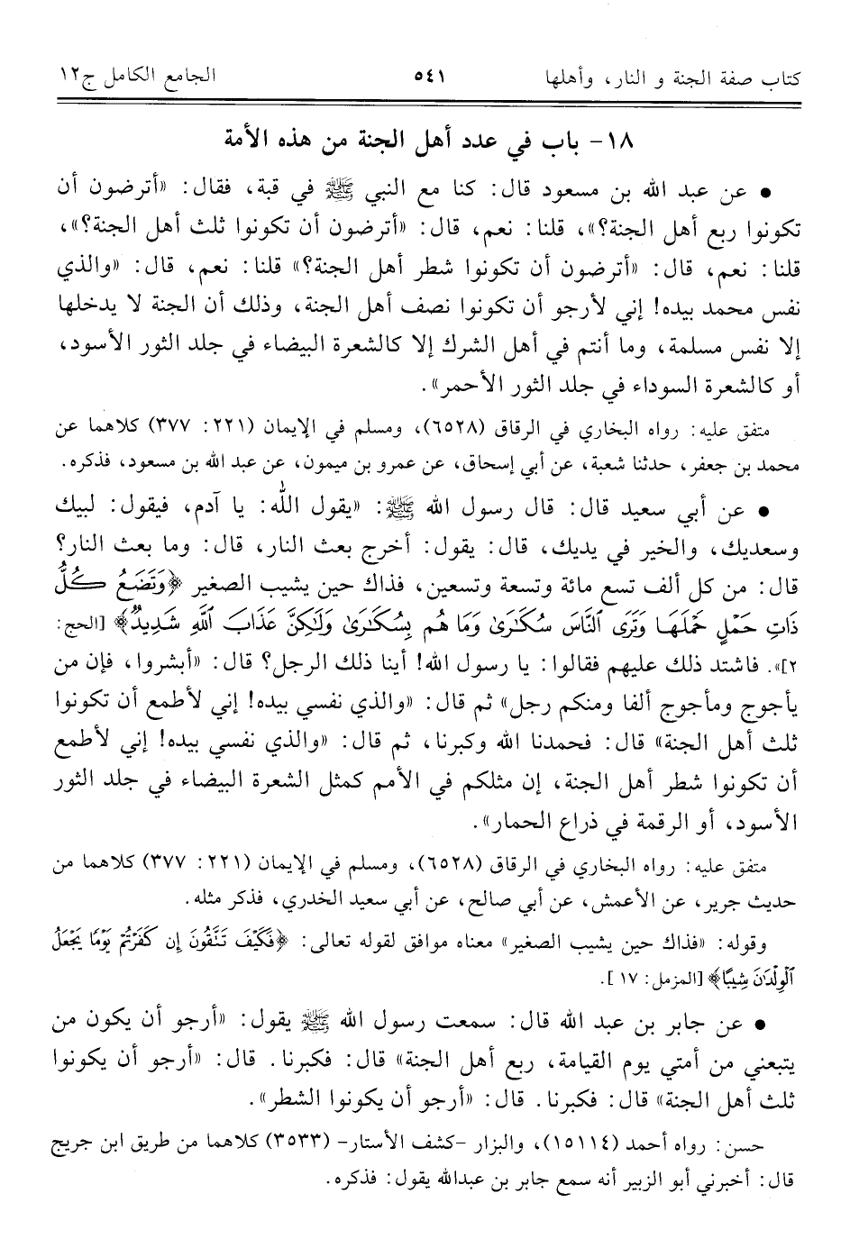 • عن جابر بن عبد اللَّه قال: سمعت رسول اللَّه -صلى اللَّه عليه وسلم- يقول: "أرجو أن يكون من يتبعني من أمتي يوم القيامة، ربع أهل الجنة" قال: فكبرنا. قال: "أرجو أن يكونوا ثلث أهل الجنة" قال: فكبرنا. قال: "أرجو أن يكونوا الشطر".