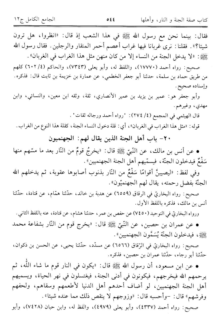 • عن عمران بن حصين، عن النّبيّ -صلى اللَّه عليه وسلم- قال: "يخرج قوم من النّار بشفاعة محمد -صلى اللَّه عليه وسلم- فيدخلون الجنّة يُسَمَّون الجهنميين".