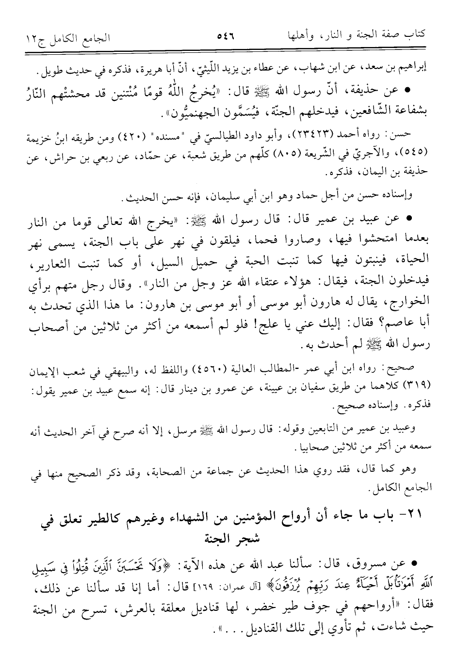 ٢١ - باب ما جاء أن أرواح المؤمنين من الشهداء وغيرهم كالطير تعلق في شجر الجنة