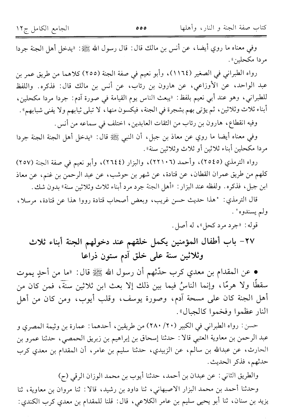 ٢٧ - باب أطفال المؤمنين يكمل خلقهم عند دخولهم الجنة أبناء ثلاث وثلاثين سنة على خلق آدم ستون ذراعا