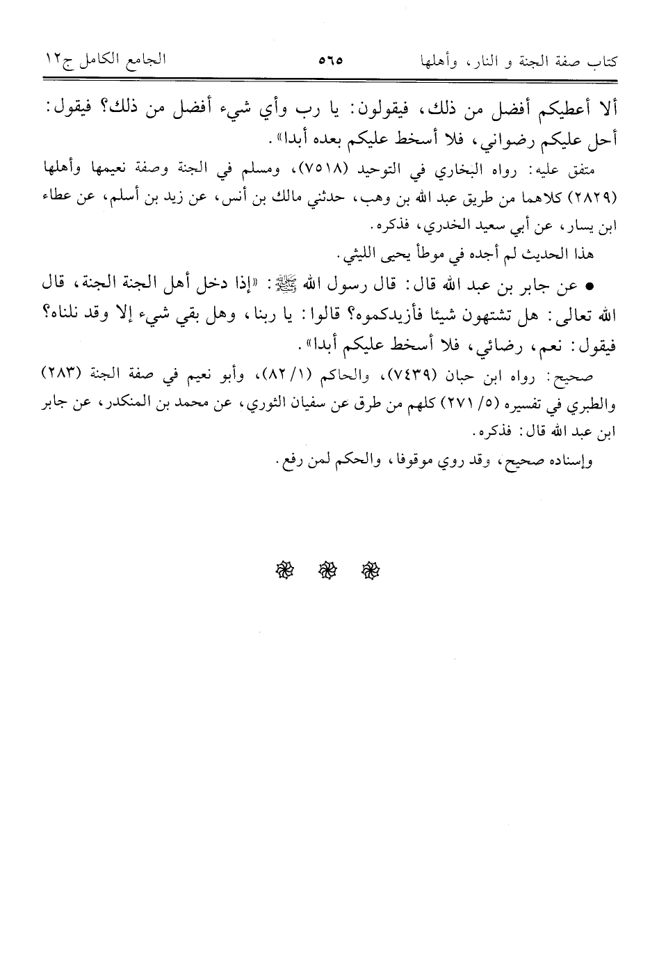 • عن جابر بن عبد اللَّه قال: قال رسول اللَّه -صلى اللَّه عليه وسلم-: "إذا دخل أهل الجنة الجنة، قال اللَّه تعالى: هل تشتهون شيئًا فأزيدكموه؟ قالوا: يا ربنا، وهل بقي شيء إلا وقد نلناه؟ فيقول: نعم، رضائي، فلا أسخط عليكم أبدا".