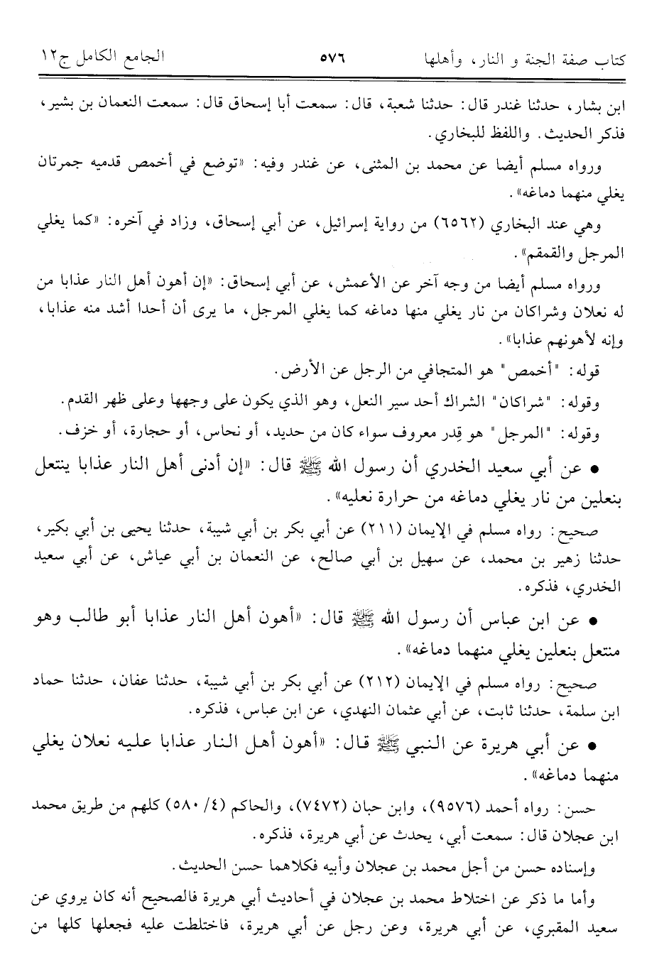 ورواه مسلم أيضًا من وجه آخر عن الأعمش، عن أبي إسحاق: "إن أهون أهل النار عذابا من له نعلان وشراكان من نار يغلي منها دماغه كما يغلي المرجل، ما يرى أن أحدا أشد منه عذابا، وإنه لأهونهم عذابا".