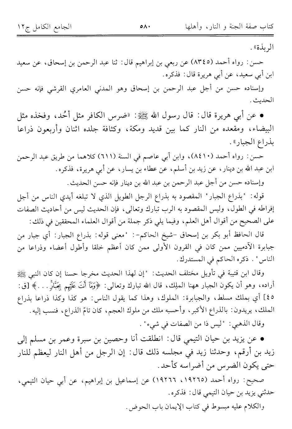 • عن يزيد بن حيان التيمي قال: انطلقت أنا وحصين بن سبرة وعمر بن مسلم إلى زيد بن أرقم، وحدثنا زيد في مجلسه ذلك قال: إن الرجل من أهل النار ليعظم للنار حتى يكون الضرس من أضراسه كأحد.