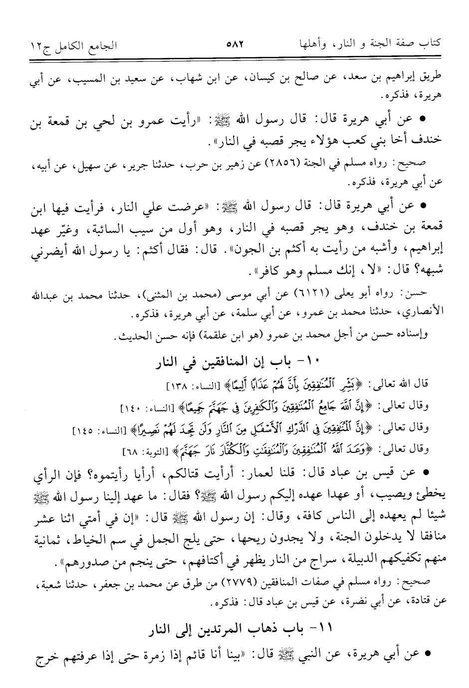 • عن أبي هريرة قال: قال رسول اللَّه -صلى اللَّه عليه وسلم-: "رأيت عمرو بن لحي بن قمعة بن خندف أخا بني كعب هؤلاء يجر قصبه في النار".