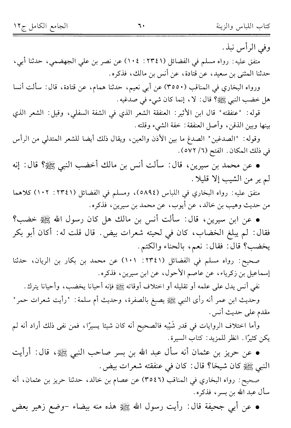 ورواه البخاريّ في المناقب (٣٥٥٠) عن أبي نعيم، حدّثنا همام، عن قتادة، قالي: سألت أنسا هل خضب النبي -صلى اللَّه عليه وسلم-؟ قال: لا، إنما كان شيء في صدغيه.