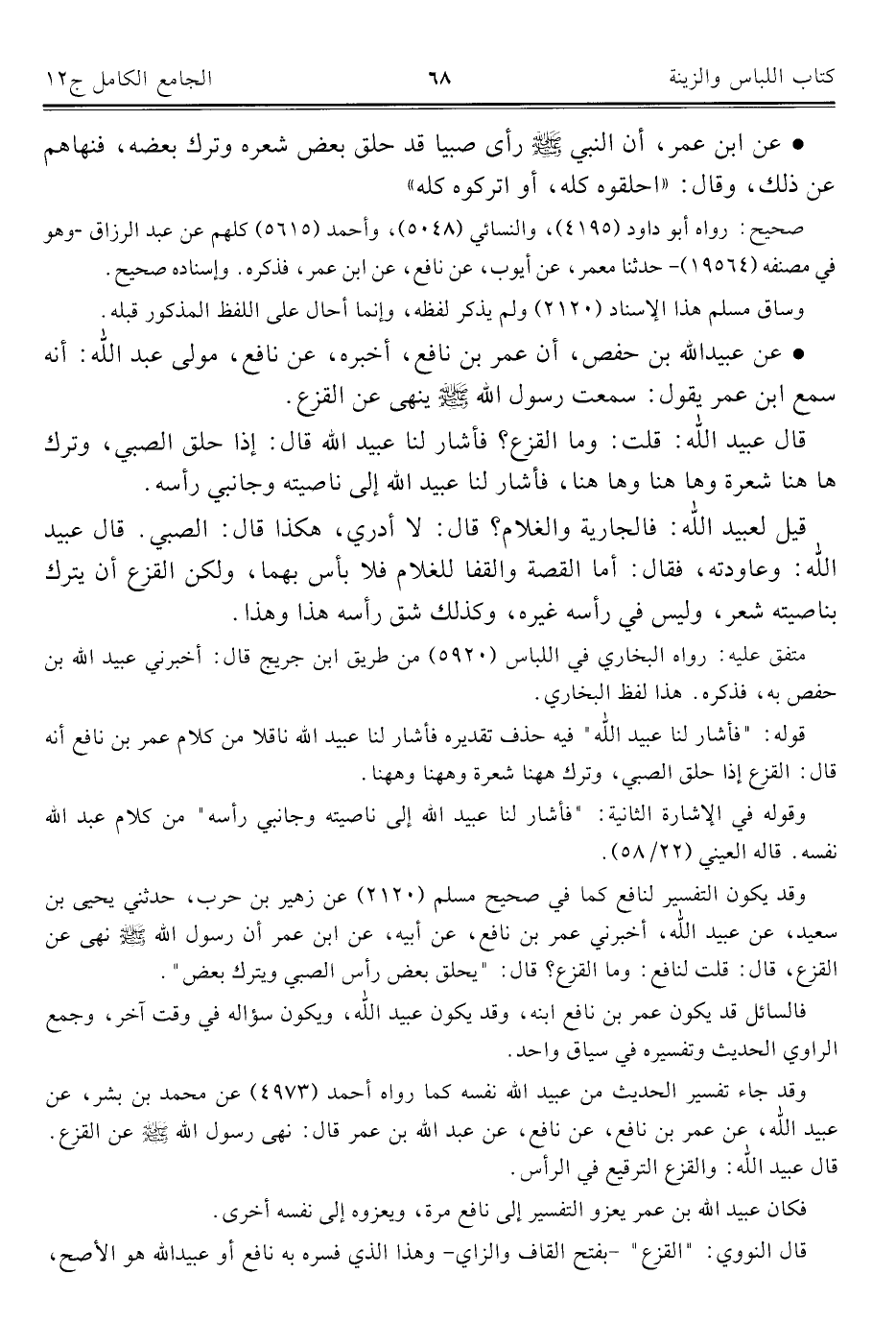 وقد يكون التفسير لنافع كما في صحيح مسلم (٢١٢٠) عن زهير بن حرب، حدثني يحيى بن سعيد، عن عبيد اللَّه، أخبرني عمر بن نافع، عن أبيه، عن ابن عمر أن رسول اللَّه -صلى اللَّه عليه وسلم- نهى عن القزع، قال: قلت لنافع: وما القزع؟ قال: "يحلق بعض رأس الصبي ويترك بعض".