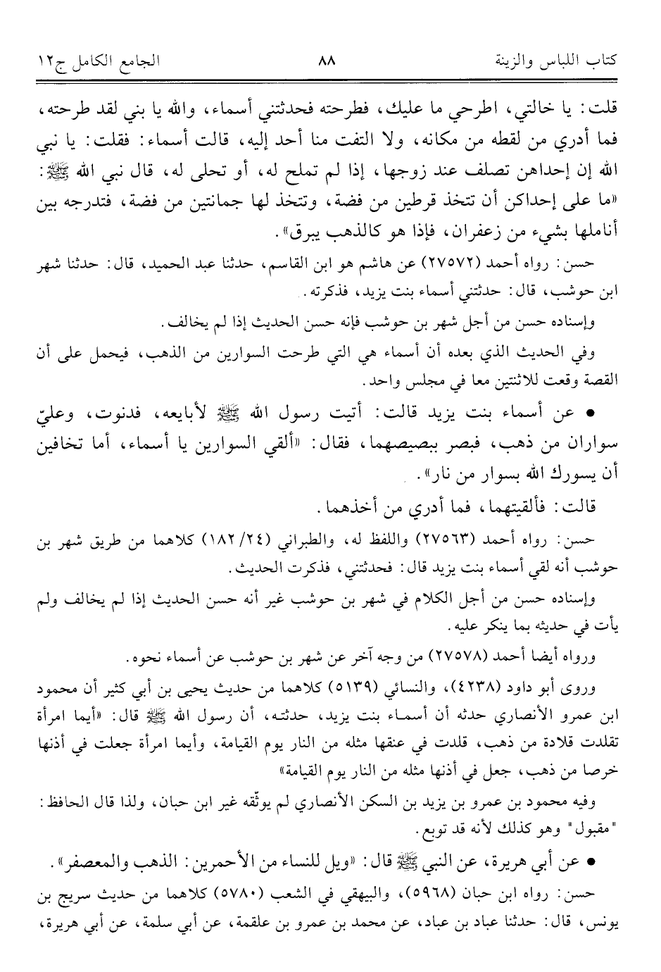 حسن: رواه أحمد (٢٧٥٧٢) عن هاشم هو ابن القاسم، حدّثنا عبد الحميد، قال: حدّثنا شهر ابن حوشب، قال: حدثتني أسماء بنت يزيد، فذكرته.