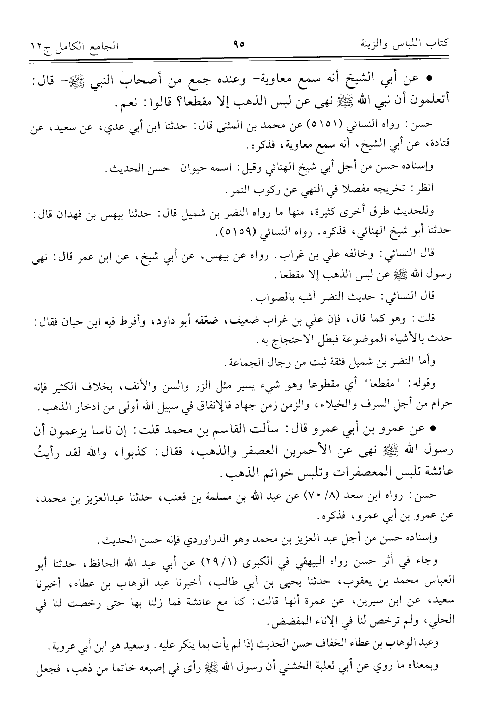 • عن أبي الشيخ أنه سمع معاوية -وعنده جمع من أصحاب النبي -صلى اللَّه عليه وسلم- قال: أتعلمون أن نبي اللَّه -صلى اللَّه عليه وسلم- نهى عن لبس الذهب إلا مقطعا؟ قالوا: نعم.