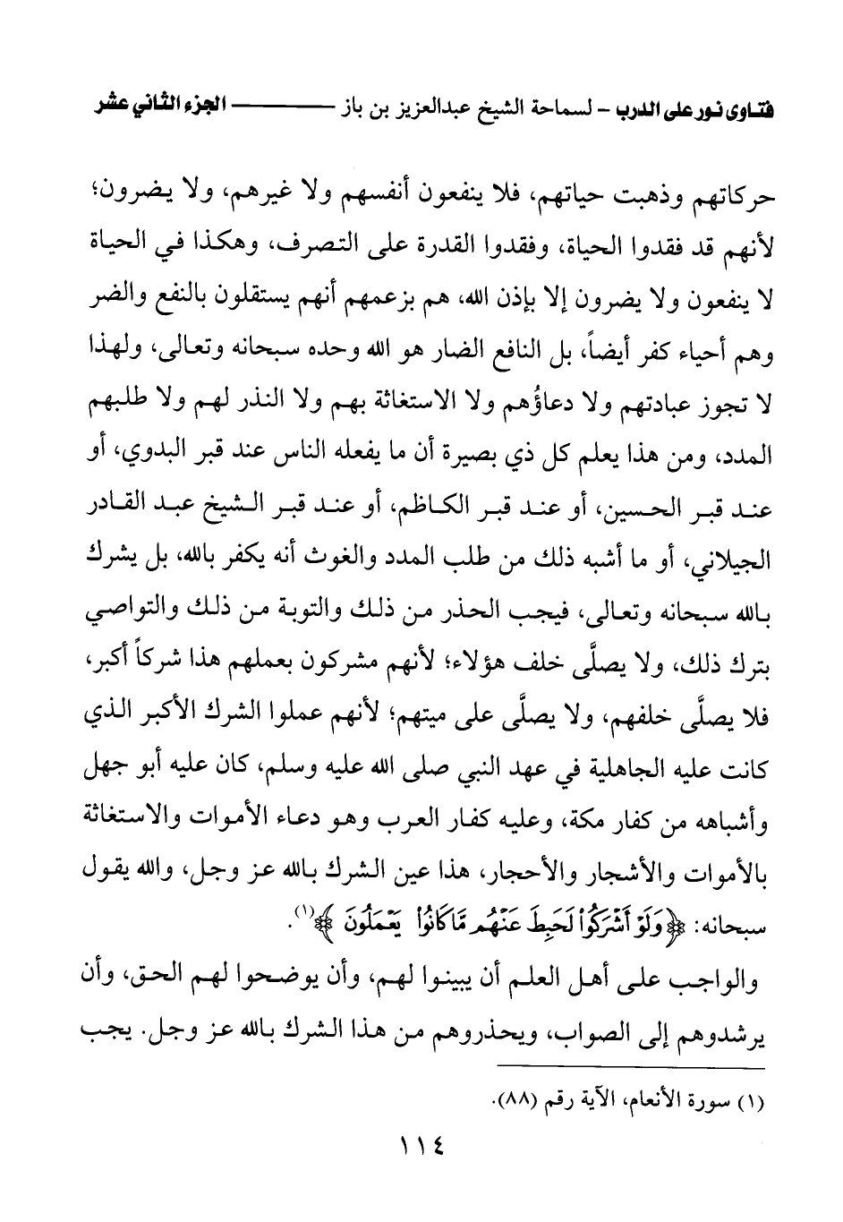حركاتهم وذهبت حياتهم، فلا ينفعون أنفسهم ولا غيرهم، ولا يضرون؛ لأنهم قد فقدوا الحياة، وفقدوا القدرة على التصرف، وهكذا في الحياة لا ينفعون ولا يضرون إلا بإذن الله، هم بزعمهم أنهم يستقلون بالنفع والضر وهم أحياء كفر أيضا، بل النافع الضار هو الله وحده سبحانه وتعالى، ولهذا لا تجوز عبادتهم ولا دعاؤهم ولا الاستغاثة بهم ولا النذر لهم ولا طلبهم المدد، ومن هذا يعلم كل ذي بصيرة أن ما يفعله الناس عند قبر البدوي، أو عند قبر الحسين، أو عند قبر الكاظم، أو عند قبر الشيخ عبد القادر الجيلاني، أو ما أشبه ذلك من طلب المدد والغوث أنه يكفر بالله، بل يشرك بالله سبحانه وتعالى، فيجب الحذر من ذلك والتوبة من ذلك والتواصي بترك ذلك، ولا يصلى خلف هؤلاء؛ لأنهم مشركون بعملهم هذا شركا أكبر، فلا يصلى خلفهم، ولا يصلى على ميتهم؛ لأنهم عملوا الشرك الأكبر الذي كانت عليه الجاهلية في عهد النبي صلى الله عليه وسلم، كان عليه أبو جهل وأشباهه من كفار مكة، وعليه كفار العرب وهو دعاء الأموات والاستغاثة بالأموات والأشجار والأحجار، هذا عين الشرك بالله عز وجل، والله يقول سبحانه: {وَلَوْ أَشْرَكُوا لَحَبِطَ عَنْهُمْ مَا كَانُوا يَعْمَلُونَ} (¬1).