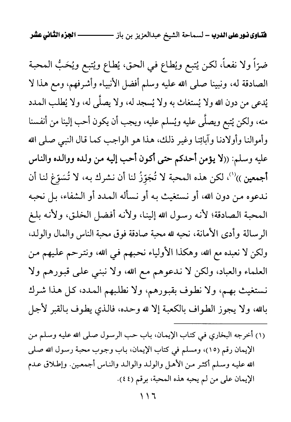 ضرا ولا نفعا، لكن يتبع ويطاع في الحق، يطاع ويتبع ويحب المحبة الصادقة له، ونبينا صلى الله عليه وسلم أفضل الأنبياء وأشرفهم، ومع هذا لا يدعى من دون الله ولا يستغاث به ولا يسجد له، ولا يصلى له، ولا يطلب المدد منه، ولكن يتبع ويصلى عليه ويسلم عليه، ويجب أن يكون أحب إلينا من أنفسنا وأموالنا وأولادنا وآبائنا وغير ذلك، هذا هو الواجب كما قال النبي صلى الله عليه وسلم: «لا يؤمن أحدكم حتى أكون أحب إليه من ولده ووالده والناس أجمعين (¬1)» لكن هذه المحبة لا تجوز لنا أن نشرك به، لا تسوغ لنا أن ندعوه من دون الله، أو نستغيث به أو نسأله المدد أو الشفاء، بل نحبه المحبة الصادقة؛ لأنه رسول الله إلينا، ولأنه أفضل الخلق، ولأنه بلغ الرسالة وأدى الأمانة، نحبه لله محبة صادقة فوق محبة الناس والمال والولد، ولكن لا نعبده مع الله، وهكذا الأولياء نحبهم في الله، ونترحم عليهم من العلماء والعباد، ولكن لا ندعوهم مع الله، ولا نبني على قبورهم ولا نستغيث بهم، ولا نطوف بقبورهم، ولا نطلبهم المدد، كل هذا شرك بالله، ولا يجوز الطواف بالكعبة إلا لله وحده، فالذي يطوف بالقبر لأجل
