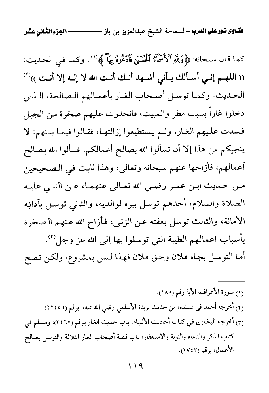 كما قال سبحانه: {وَلِلَّهِ الْأَسْمَاءُ الْحُسْنَى فَادْعُوهُ بِهَا} (¬1). وكما في الحديث: «اللهم إني أسألك بأني أشهد أنك أنت الله لا إله إلا أنت (¬2)» الحديث. وكما توسل أصحاب الغار بأعمالهم الصالحة، الذين دخلوا غارا بسبب مطر والمبيت، فانحدرت عليهم صخرة من الجبل فسدت عليهم الغار، ولم يستطيعوا إزالتها، فقالوا فيما بينهم: لا ينجيكم من هذا إلا أن تسألوا الله بصالح أعمالكم. فسألوا الله بصالح أعمالهم، فأزاحها عنهم سبحانه وتعالى، وهذا ثابت في الصحيحين من حديث ابن عمر رضي الله تعالى عنهما، عن النبي عليه الصلاة والسلام، أحدهم توسل ببره لوالديه، والثاني توسل بأدائه الأمانة، والثالث توسل بعفته عن الزنى، فأزاح الله عنهم الصخرة بأسباب أعمالهم الطيبة التي توسلوا بها إلى الله عز وجل؟