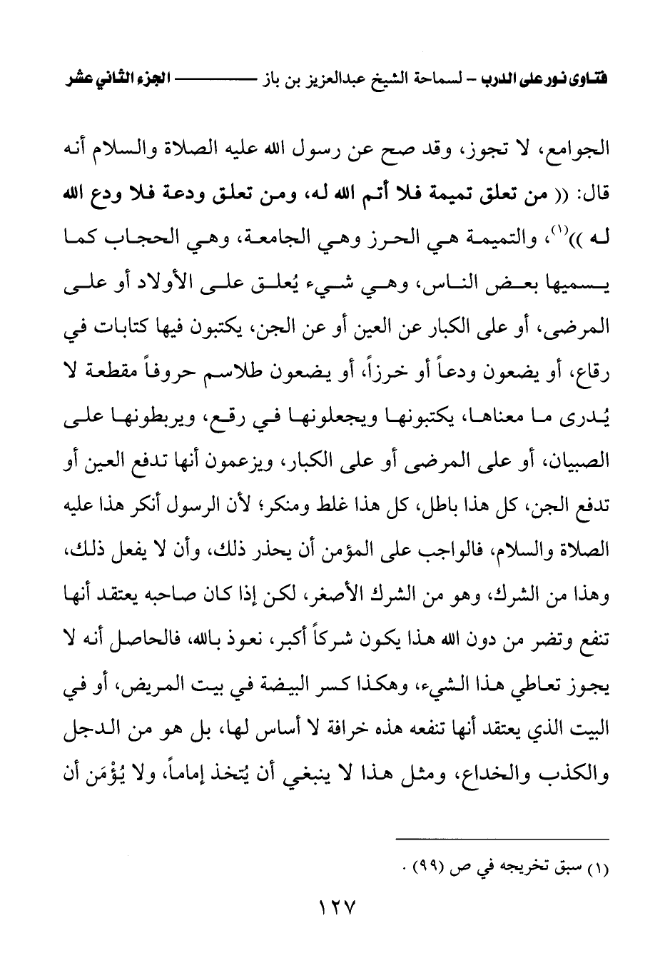 الجوامع، لا تجوز، وقد صح عن رسول الله عليه الصلاة والسلام أنه قال: «من تعلق تميمة فلا أتم الله له، ومن تعلق ودعة فلا ودع الله له (¬1)» والتميمة هي الحرز وهي الجامعة، وهي الحجاب كما يسميها بعض الناس، وهي شيء يعلق على الأولاد أو على المرضى، أو على الكبار عن العين أو عن الجن، يكتبون فيها كتابات في رقاع، أو يضعون ودعا أو خرزا، أو يضعون طلاسم حروفا مقطعة لا يدرى ما معناها، يكتبونها ويجعلونها في رقع، ويربطونها على الصبيان، أو على المرضى أو على الكبار، ويزعمون أنها تدفع العين أو تدفع الجن، كل هذا باطل، كل هذا غلط ومنكر؛ لأن الرسول أنكر هذا عليه الصلاة والسلام، فالواجب على المؤمن أن يحذر ذلك، وأن لا يفعل ذلك، وهذا من الشرك، وهو من الشرك الأصغر، لكن إذا كان صاحبه يعتقد أنها تنفع وتضر من دون الله هذا يكون شركا أكبر، نعوذ بالله، فالحاصل أنه لا يجوز تعاطي هذا الشيء، وهكذا كسر البيضة في بيت المريض، أو في البيت الذي يعتقد أنها تنفعه هذه خرافة لا أساس لها، بل هو من الدجل والكذب والخداع، ومثل هذا لا ينبغي أن يتخذ إماما، ولا يؤمن أن