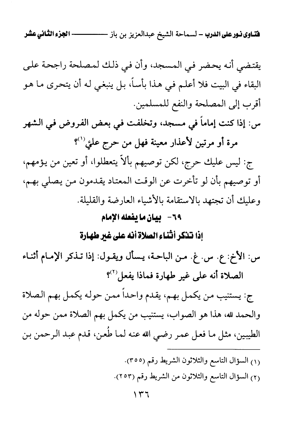 س: إذا كنت إماما في مسجد، وتخلفت في بعض الفروض في الشهر مرة أو مرتين لأعذار معينة فهل من حرج علي (¬1)؟