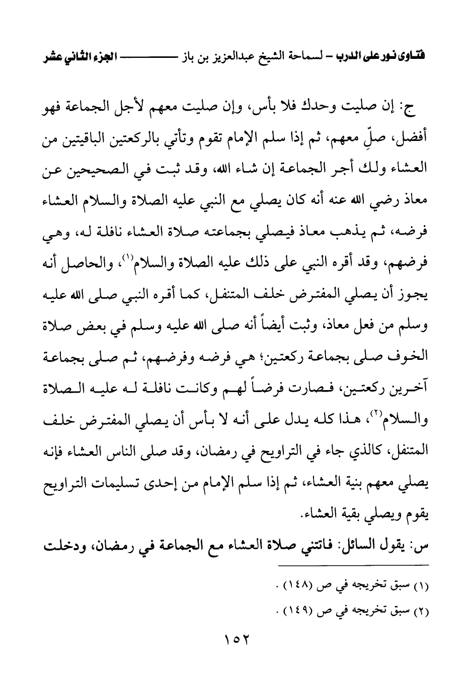 ج: إن صليت وحدك فلا بأس، وإن صليت معهم لأجل الجماعة فهو أفضل، صل معهم، ثم إذا سلم الإمام تقوم وتأتي بالركعتين الباقيتين من العشاء ولك أجر الجماعة إن شاء الله، وقد ثبت في الصحيحين عن معاذ رضي الله عنه «أنه كان يصلي مع النبي عليه الصلاة والسلام العشاء فرضه، ثم يذهب معاذ فيصلي بجماعته صلاة العشاء نافلة له، وهي فرضهم، وقد أقره النبي على ذلك عليه الصلاة والسلام (¬1)» والحاصل أنه يجوز أن يصلي المفترض خلف المتنفل، كما أقره النبي صلى الله عليه وسلم من فعل معاذ، وثبت أيضا أنه صلى الله عليه وسلم في بعض صلاة الخوف صلى بجماعة ركعتين؛ هي فرضه وفرضهم، ثم صلى بجماعة آخرين ركعتين، فصارت فرضا لهم وكانت نافلة له عليه الصلاة والسلام (¬2) هذا كله يدل على أنه لا بأس أن يصلي المفترض خلف المتنفل، كالذي جاء في التراويح في رمضان، وقد صلى الناس العشاء فإنه يصلي معهم بنية العشاء، ثم إذا سلم الإمام من إحدى تسليمات التراويح يقوم ويصلي بقية العشاء.