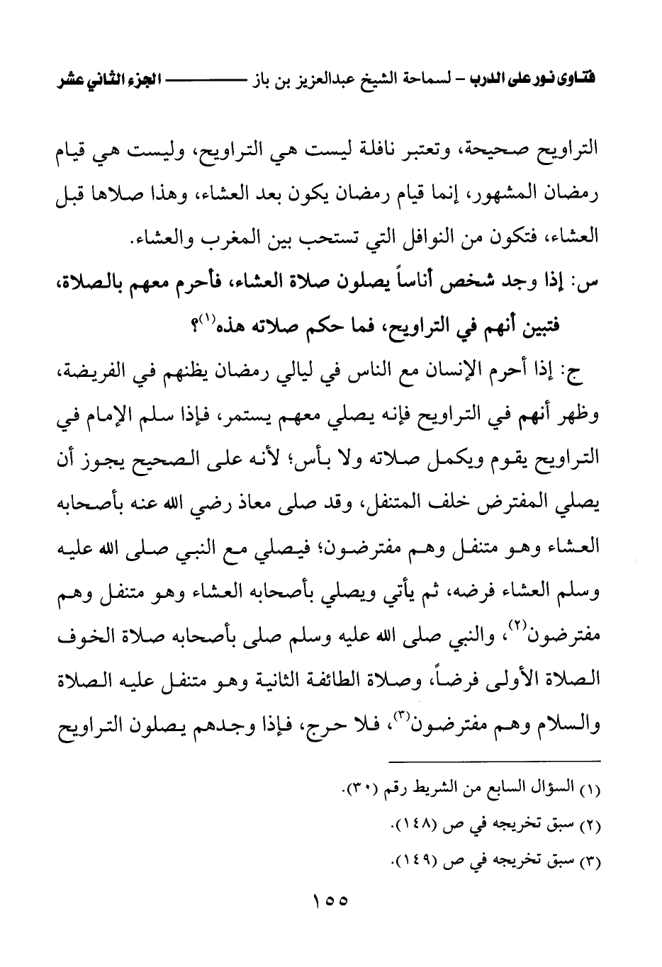 ج: إذا أحرم الإنسان مع الناس في ليالي رمضان يظنهم في الفريضة، وظهر أنهم في التراويح فإنه يصلي معهم يستمر، فإذا سلم الإمام في التراويح يقوم ويكمل صلاته ولا بأس؛ لأنه على الصحيح يجوز أن يصلي المفترض خلف المتنفل، «وقد صلى معاذ رضي الله عنه بأصحابه العشاء وهو متنفل وهم مفترضون؛ فيصلي مع النبي صلى الله عليه وسلم العشاء فرضه، ثم يأتي ويصلي بأصحابه العشاء وهو متنفل وهم مفترضون (¬2)» والنبي صلى الله عليه وسلم صلى بأصحابه صلاة الخوف الصلاة الأولى فرضا، وصلاة الطائفة الثانية وهو متنفل عليه الصلاة والسلام وهم مفترضون (¬3) فلا حرج، فإذا وجدهم يصلون التراويح