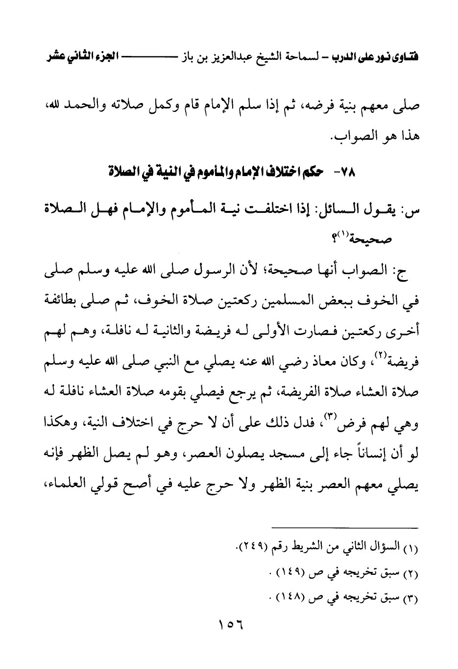 ج: الصواب أنها صحيحة؛ لأن الرسول صلى الله عليه وسلم صلى في الخوف ببعض المسلمين ركعتين صلاة الخوف، ثم صلى بطائفة أخرى ركعتين فصارت الأولى له فريضة والثانية له نافلة، وهم لهم فريضة (¬2) وكان معاذ رضي الله عنه يصلي مع النبي صلى الله عليه وسلم صلاة العشاء صلاة الفريضة، ثم يرجع فيصلي بقومه صلاة العشاء نافلة له وهي لهم فرض (¬3) فدل ذلك على أن لا حرج في اختلاف النية، وهكذا لو أن إنسانا جاء إلى مسجد يصلون العصر، وهو لم يصل الظهر فإنه يصلي معهم العصر بنية الظهر ولا حرج عليه في أصح قولي العلماء،