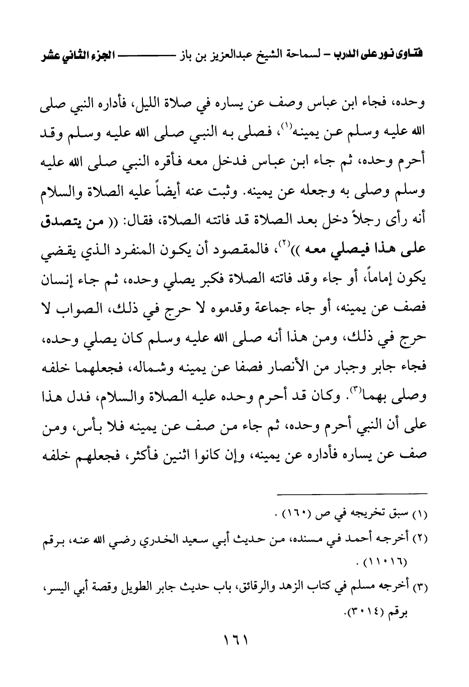 وحده، فجاء ابن عباس وصف عن يساره في صلاة الليل، فأداره النبي صلى الله عليه وسلم عن يمينه (¬1)» فصلى به النبي صلى الله عليه وسلم وقد أحرم وحده، ثم جاء ابن عباس فدخل معه فأقره النبي صلى الله عليه وسلم وصلى به وجعله عن يمينه. وثبت عنه أيضا عليه الصلاة والسلام أنه رأى رجلا دخل بعد الصلاة قد فاتته الصلاة، فقال: «من يتصدق على هذا فيصلي معه (¬2)» فالمقصود أن يكون المنفرد الذي يقضي يكون إماما، أو جاء وقد فاتته الصلاة فكبر يصلي وحده، ثم جاء إنسان فصف عن يمينه، أو جاء جماعة وقدموه لا حرج في ذلك، الصواب لا حرج في ذلك، ومن هذا «أنه صلى الله عليه وسلم كان يصلي وحده، فجاء جابر وجبار من الأنصار فصفا عن يمينه وشماله، فجعلهما خلفه وصلى بهما (¬3)» وكان قد أحرم وحده عليه الصلاة والسلام، فدل هذا على أن النبي أحرم وحده، ثم جاء من صف عن يمينه فلا بأس، ومن صف عن يساره فأداره عن يمينه، وإن كانوا اثنين فأكثر، فجعلهم خلفه