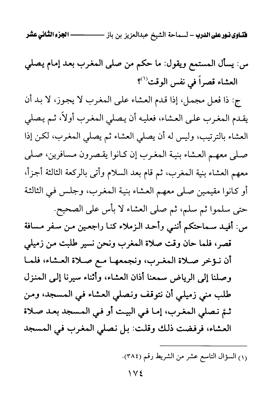 س: أفيد سماحتكم أنني وأحد الزملاء كنا راجعين من سفر مسافة قصر، فلما حان وقت صلاة المغرب ونحن نسير طلبت من زميلي أن نؤخر صلاة المغرب، ونجمعها مع صلاة العشاء، فلما وصلنا إلى الرياض سمعنا أذان العشاء، وأثناء سيرنا إلى المنزل طلب مني زميلي أن نتوقف ونصلي العشاء في المسجد، ومن ثم نصلي المغرب، إما في البيت أو في المسجد بعد صلاة العشاء، فرفضت ذلك وقلت: بل نصلي المغرب في المسجد