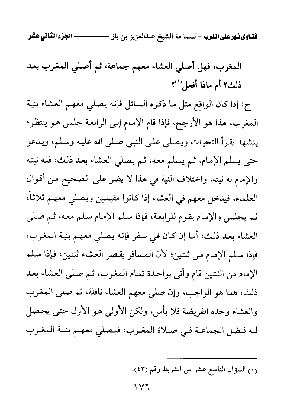 ج: إذا كان الواقع مثل ما ذكره السائل فإنه يصلي معهم العشاء بنية المغرب، هذا هو الأرجح، فإذا قام الإمام إلى الرابعة جلس هو ينتظر؛ يتشهد يقرأ التحيات ويصلي على النبي صلى الله عليه وسلم، ويدعو حتى يسلم الإمام، ثم يسلم معه، ثم يصلي العشاء بعد ذلك، فله نيته والإمام له نيته، واختلاف النية في هذا لا يضر على الصحيح من أقوال العلماء، فيدخل معهم في العشاء إذا كانوا مقيمين ويصلي معهم ثلاثا، ثم يجلس والإمام يقوم للرابعة، فإذا سلم الإمام سلم معه، ثم صلى العشاء بعد ذلك، أما إن كان في سفر فإنه يصلي معهم بنية المغرب، فإذا سلم الإمام من ثنتين؛ لأن المسافر يقصر العشاء ثنتين، فإذا سلم الإمام من الثنتين قام وأتى بواحدة تمام المغرب، ثم صلى العشاء بعد ذلك، هذا هو الواجب، وإن صلى معهم العشاء نافلة، ثم صلى المغرب والعشاء وحده الفريضة فلا بأس، ولكن الأولى هو الأول حتى يحصل له فضل الجماعة في صلاة المغرب، فيصلي معهم بنية المغرب