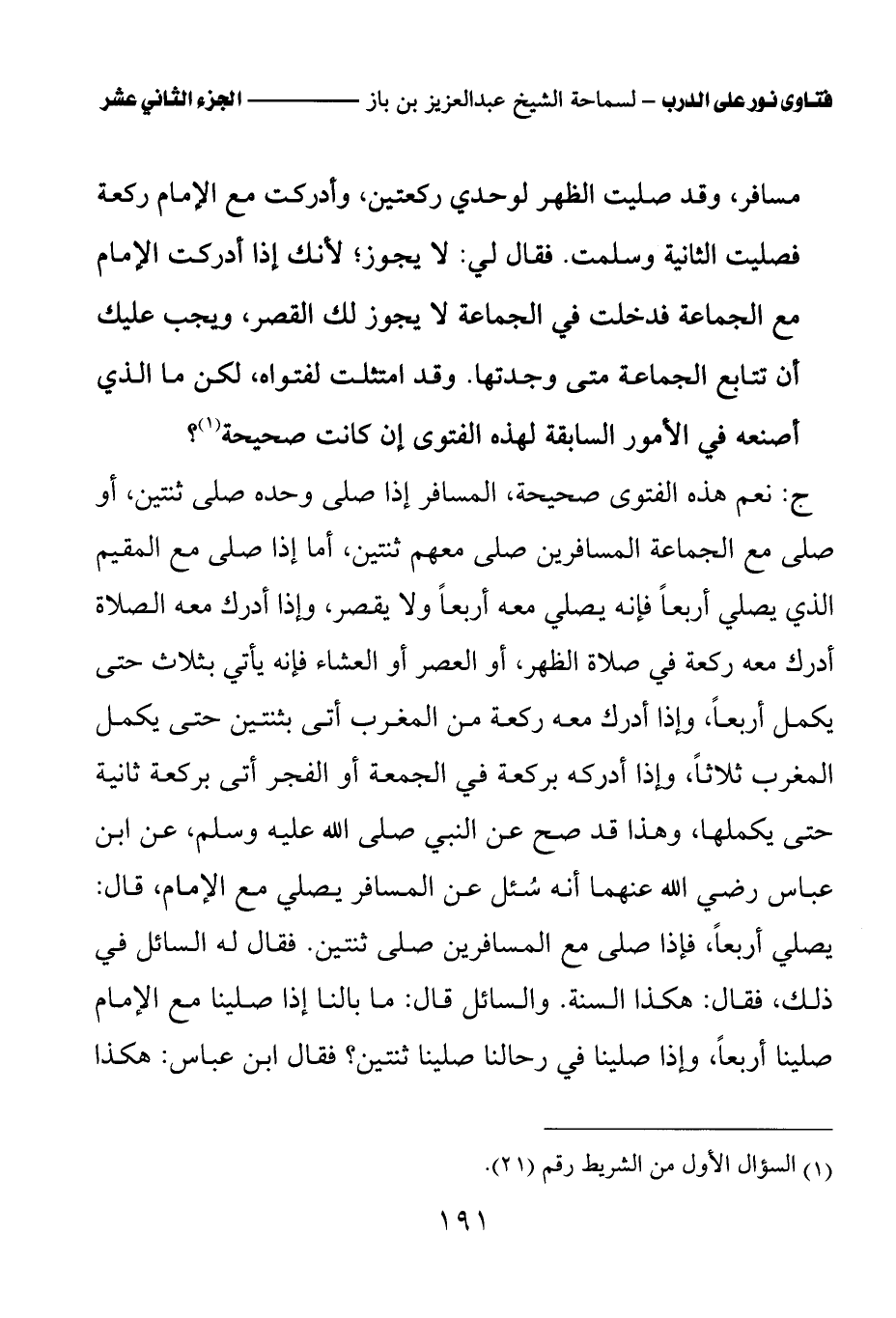 ج: نعم هذه الفتوى صحيحة، المسافر إذا صلى وحده صلى ثنتين، أو صلى مع الجماعة المسافرين صلى معهم ثنتين، أما إذا صلى مع المقيم الذي يصلي أربعا فإنه يصلي معه أربعا ولا يقصر، وإذا أدرك معه الصلاة أدرك معه ركعة في صلاة الظهر، أو العصر أو العشاء فإنه يأتي بثلاث حتى يكمل أربعا، وإذا أدرك معه ركعة من المغرب أتى بثنتين حتى يكمل المغرب ثلاثا، وإذا أدركه بركعة في الجمعة أو الفجر أتى بركعة ثانية حتى يكملها، وهذا قد صح عن النبي صلى الله عليه وسلم، عن ابن عباس رضي الله عنهما أنه سئل عن المسافر يصلي مع الإمام، قال: يصلي أربعا، فإذا صلى مع المسافرين صلى ثنتين. فقال له السائل في ذلك، فقال: هكذا السنة. والسائل قال: «ما بالنا إذا صلينا مع الإمام صلينا أربعا، وإذا صلينا في رحالنا صلينا ثنتين؟ فقال ابن عباس: هكذا