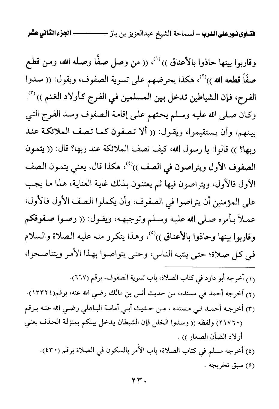 وقاربوا بينها حاذوا بالأعناق (¬1)» «من وصل صفا وصله الله، ومن قطع صفا قطعه الله (¬2)» هكذا يحرضهم على تسوية الصفوف، ويقول: «سدوا الفرج، فإن الشياطين تدخل بين المسلمين في الفرج كأولاد الغنم (¬3)» وكان صلى الله عليه وسلم يحثهم على إقامة الصفوف وسد الفرج التي بينهم، وأن يستقيموا، ويقول: «ألا تصفون كما تصف الملائكة عند ربها؟ " قالوا: يا رسول الله، كيف تصف الملائكة عند ربها؟ قال: " يتمون الصفوف الأول ويتراصون في الصف (¬4)» هكذا قال، يعني يتمون الصف الأول فالأول، ويتراصون فيها ثم يعتنون بذلك غاية العناية، هذا ما يجب على المؤمنين أن يتراصوا في الصفوف، وأن يكملوا الصف الأول فالأول؛ عملا بأمره صلى الله عليه وسلم وتوجيهه، ويقول: «رصوا صفوفكم وقاربوا بينها وحاذوا بالأعناق (¬5)» وهذا يتكرر منه عليه الصلاة والسلام في كل صلاة؛ حتى ينتبه الناس، وحتى يتواصوا بهذا الأمر ويتناصحوا،
