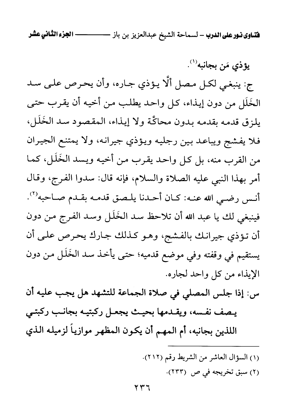 ج: ينبغي لكل مصل ألا يؤذي جاره، وأن يحرص على سد الخلل من دون إيذاء، كل واحد يطلب من أخيه أن يقرب حتى يلزق قدمه بقدمه بدون محاكة ولا إيذاء، المقصود سد الخلل، فلا يفشج ويباعد بين رجليه ويؤذي جيرانه، ولا يمتنع الجيران من القرب منه، بل كل واحد يقرب من أخيه ويسد الخلل، كما أمر بهذا النبي عليه الصلاة والسلام، فإنه قال: سدوا الفرج، وقال أنس رضي الله عنه: «كان أحدنا يلصق قدمه بقدم صاحبه (¬2)» فينبغي لك يا عبد الله أن تلاحظ سد الخلل وسد الفرج من دون أن تؤذي جيرانك بالفشج، وهو كذلك جارك يحرص على أن يستقيم في وقفته وفي موضع قدميه؛ حتى يأخذ سد الخلل من دون الإيذاء من كل واحد لجاره.
