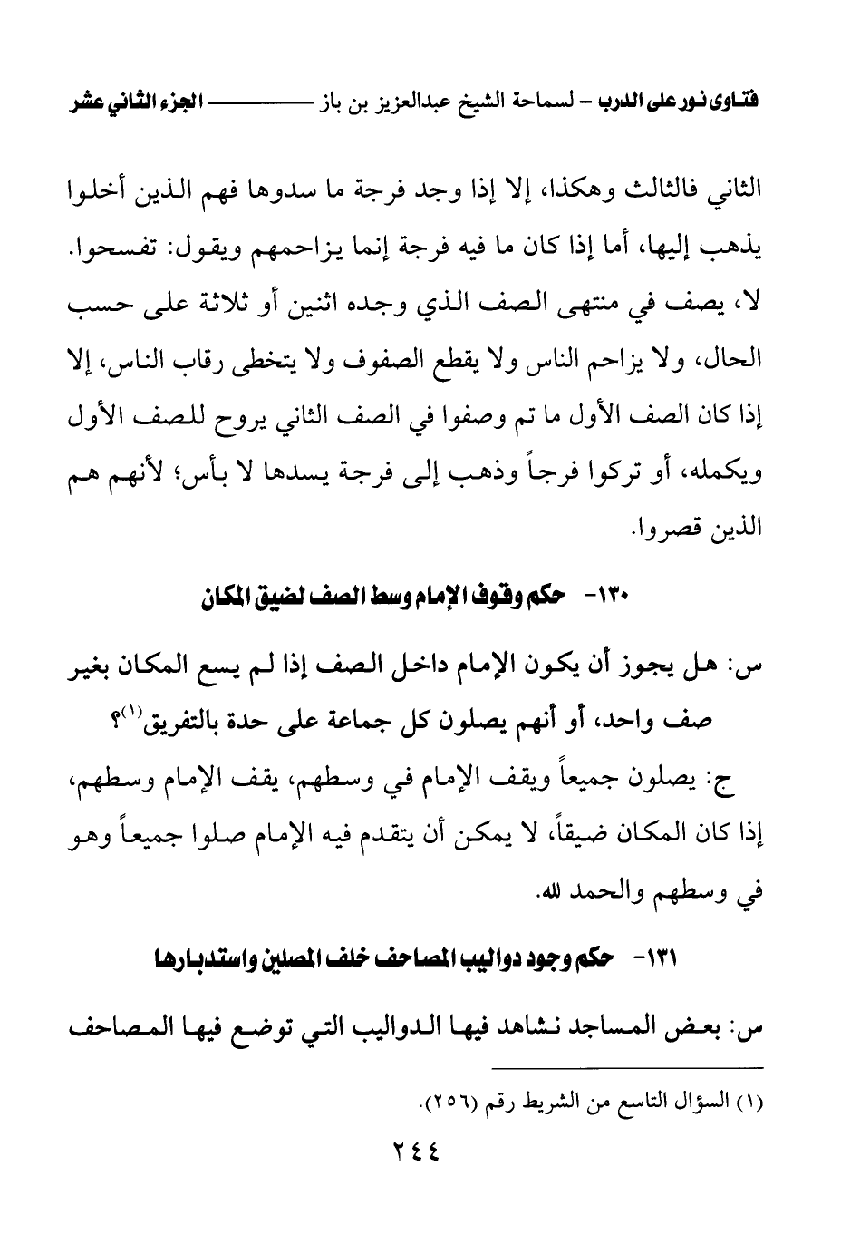 الثاني فالثالث وهكذا، إلا إذا وجد فرجة ما سدوها فهم الذين أخلوا يذهب إليها، أما إذا كان ما فيه فرجة إنما يزاحمهم ويقول: تفسحوا. لا، يصف في منتهى الصف الذي وجده اثنين أو ثلاثة على حسب الحال، ولا يزاحم الناس ولا يقطع الصفوف ولا يتخطى رقاب الناس، إلا إذا كان الصف الأول ما تم وصفوا في الصف الثاني يروح للصف الأول ويكمله، أو تركوا فرجا وذهب إلى فرجة يسدها لا بأس؛ لأنهم هم الذين قصروا.