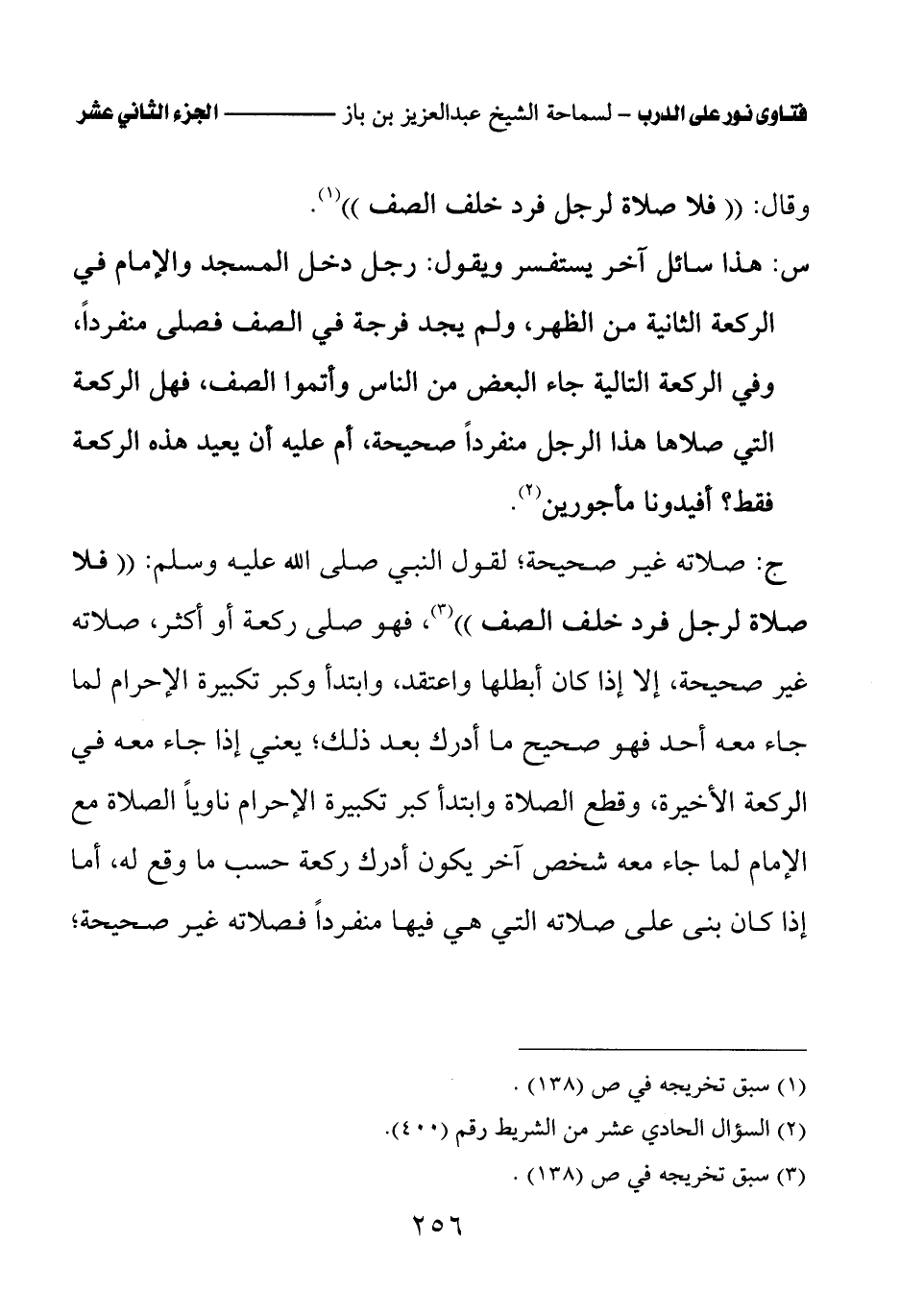 ج: صلاته غير صحيحة؛ لقول النبي صلى الله عليه وسلم: «فلا صلاة لرجل فرد خلف الصف (¬2)» فهو صلى ركعة أو أكثر، صلاته غير صحيحة، إلا إذا كان أبطلها واعتقد، وابتدأ وكبر تكبيرة الإحرام لما جاء معه أحد فهو صحيح ما أدرك بعد ذلك؛ يعني إذا جاء معه في الركعة الأخيرة، وقطع الصلاة وابتدأ كبر تكبيرة الإحرام ناويا الصلاة مع الإمام لما جاء معه شخص آخر يكون أدرك ركعة حسب ما وقع له، أما إذا كان بنى على صلاته التي هي فيها منفردا فصلاته غير صحيحة؛