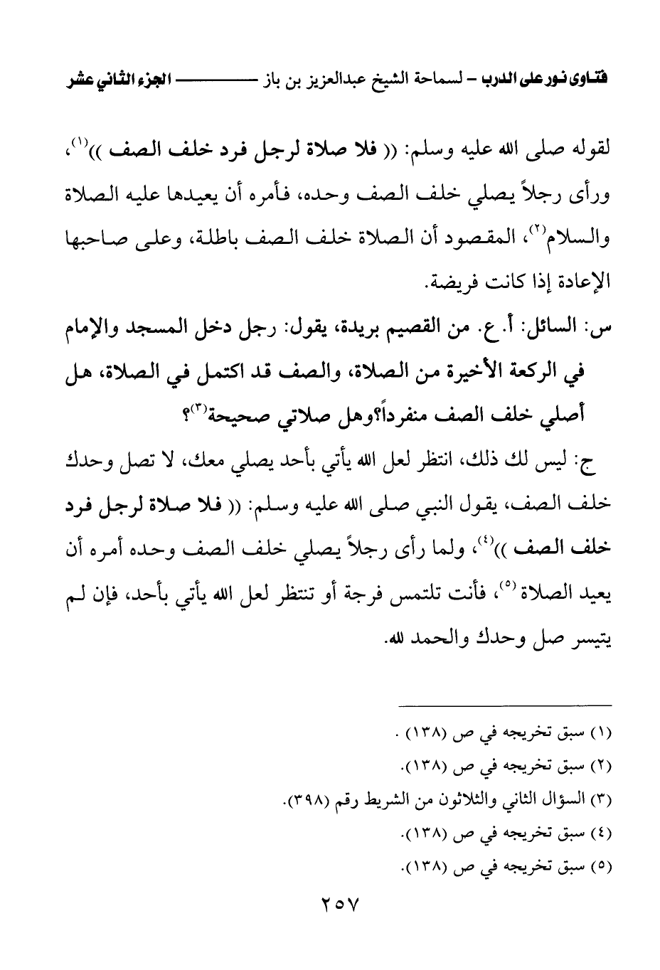 ج: ليس لك ذلك، انتظر لعل الله يأتي بأحد يصلي معك، لا تصل وحدك خلف الصف، يقول النبي صلى الله عليه وسلم: «فلا صلاة لرجل فرد خلف الصف (¬2)» «ولما رأى رجلا يصلي خلف الصف وحده أمره أن يعيد الصلاة (¬3)» فأنت تلتمس فرجة أو تنتظر لعل الله يأتي بأحد، فإن لم يتيسر صل وحدك والحمد لله.