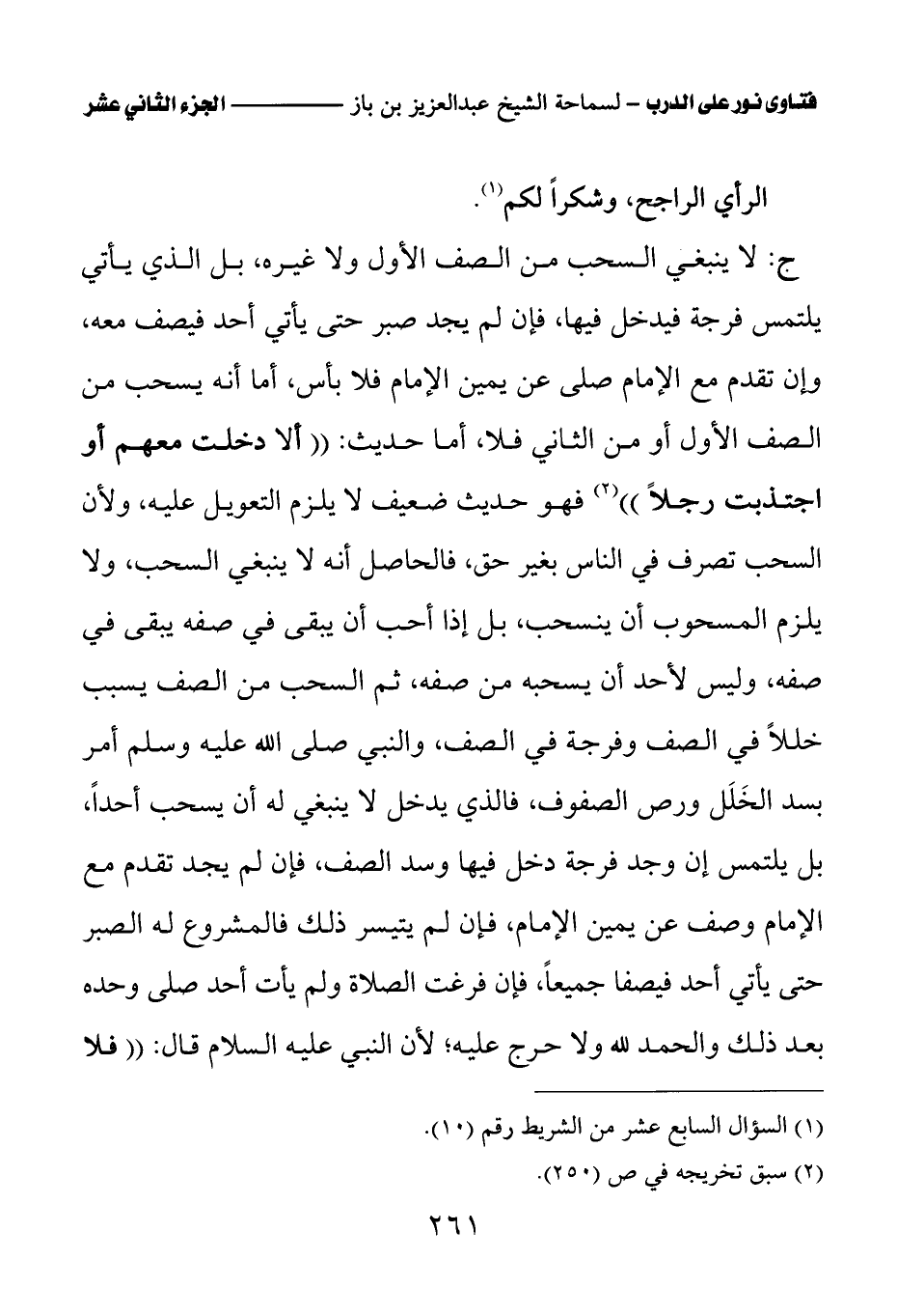 ج: لا ينبغي السحب من الصف الأول ولا غيره، بل الذي يأتي يلتمس فرجة فيدخل فيها، فإن لم يجد صبر حتى يأتي أحد فيصف معه، وإن تقدم مع الإمام صلى عن يمين الإمام فلا بأس، أما أنه يسحب من الصف الأول أو من الثاني فلا، أما حديث: «ألا دخلت معهم أو اجتذبت رجلا (¬2)» فهو حديث ضعيف لا يلزم التعويل عليه، ولأن السحب تصرف في الناس بغير حق، فالحاصل أنه لا ينبغي السحب، ولا يلزم المسحوب أن ينسحب، بل إذا أحب أن يبقى في صفه يبقى في صفه، وليس لأحد أن يسحبه من صفه، ثم السحب من الصف يسبب خللا في الصف وفرجة في الصف، والنبي صلى الله عليه وسلم أمر بسد الخلل ورص الصفوف، فالذي يدخل لا ينبغي له أن يسحب أحدا، بل يلتمس إن وجد فرجة دخل فيها وسد الصف، فإن لم يجد تقدم مع الإمام وصف عن يمين الإمام، فإن لم يتيسر ذلك فالمشروع له الصبر حتى يأتي أحد فيصفا جميعا، فإن فرغت الصلاة ولم يأت أحد صلى وحده بعد ذلك والحمد لله ولا حرج عليه؛ لأن النبي عليه السلام قال: «فلا