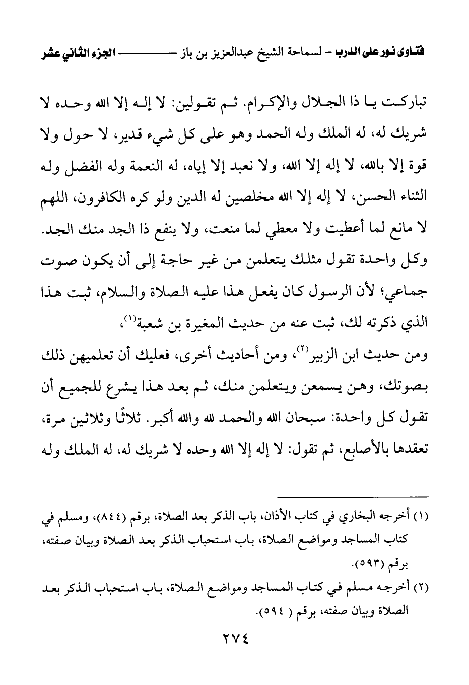 تباركت يا ذا الجلال والإكرام. ثم تقولين: لا إله إلا الله وحده لا شريك له، له الملك وله الحمد وهو على كل شيء قدير، لا حول ولا قوة إلا بالله، لا إله إلا الله، ولا نعبد إلا إياه، له النعمة وله الفضل وله الثناء الحسن، لا إله إلا الله مخلصين له الدين ولو كره الكافرون، اللهم لا مانع لما أعطيت ولا معطي لما منعت، ولا ينفع ذا الجد منك الجد. وكل واحدة تقول مثلك يتعلمن من غير حاجة إلى أن يكون صوت جماعي؛ لأن الرسول كان يفعل هذا عليه الصلاة والسلام، ثبت هذا الذي ذكرته لك، ثبت عنه من حديث المغيرة بن شعبة ومن حديث ابن الزبير ومن أحاديث أخرى، فعليك أن تعلميهن ذلك بصوتك، وهن يسمعن ويتعلمن منك، ثم بعد هذا يشرع للجميع أن تقول كل واحدة: سبحان الله والحمد لله والله أكبر. ثلاثا وثلاثين مرة، تعقدها بالأصابع، ثم تقول: لا إله إلا الله وحده لا شريك له، له الملك وله