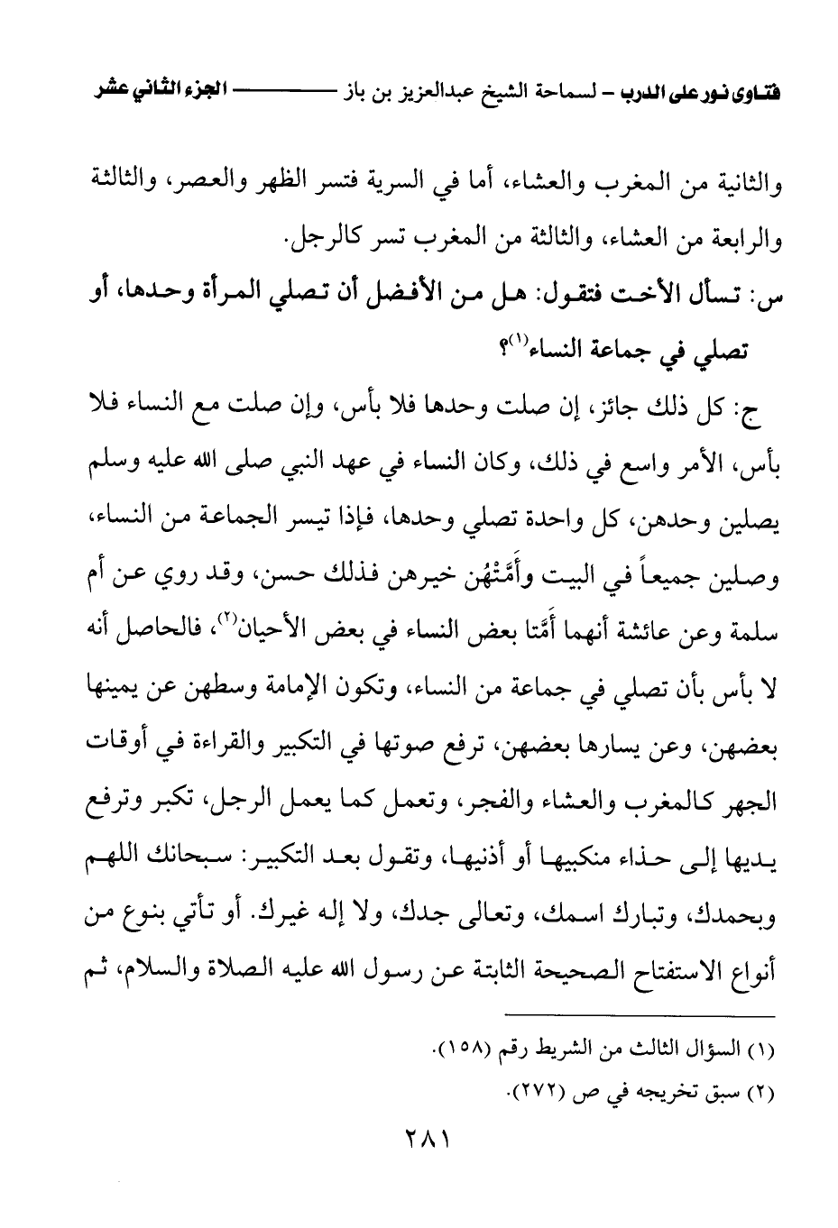 س: تسأل الأخت فتقول: هل من الأفضل أن تصلي المرأة وحدها، أو تصلي في جماعة النساء (¬1)