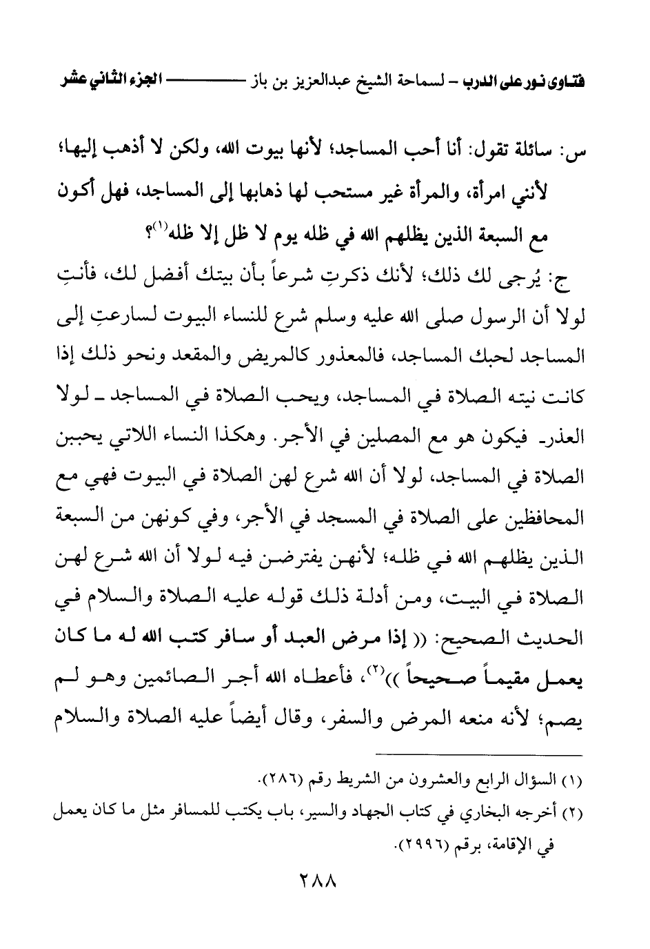 ج: يرجى لك ذلك؛ لأنك ذكرت شرعا بأن بيتك أفضل لك، فأنت لولا أن الرسول صلى الله عليه وسلم شرع للنساء البيوت لسارعت إلى المساجد لحبك المساجد، فالمعذور كالمريض والمقعد ونحو ذلك إذا كانت نيته الصلاة في المساجد، ويحب الصلاة في المساجد - لولا العذر - فيكون هو مع المصلين في الأجر. وهكذا النساء اللاتي يحببن الصلاة في المساجد، لولا أن الله شرع لهن الصلاة في البيوت فهي مع المحافظين على الصلاة في المسجد في الأجر، وفي كونهن من السبعة الذين يظلهم الله في ظله؛ لأنهن يفترضن فيه لولا أن الله شرع لهن الصلاة في البيت، ومن أدلة ذلك قوله عليه الصلاة والسلام في الحديث الصحيح: «إذا مرض العبد أو سافر كتب الله له ما كان يعمل مقيما صحيحا (¬2)» فأعطاه الله أجر الصائمين وهو لم يصم؛ لأنه منعه المرض والسفر، وقال أيضا عليه الصلاة والسلام