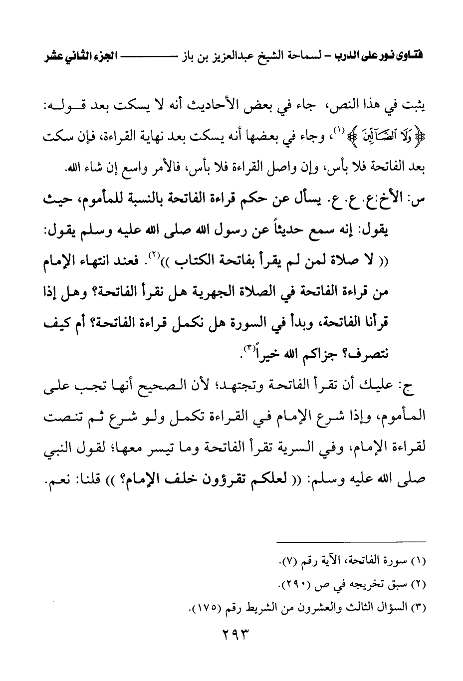 س: الأخ: ع. ع. ع. يسأل عن حكم قراءة الفاتحة بالنسبة للمأموم، حيث يقول: إنه سمع حديثا عن رسول الله صلى الله عليه وسلم يقول: «لا صلاة لمن لم يقرأ بفاتحة الكتاب (¬1)» فعند انتهاء الإمام من قراءة الفاتحة في الصلاة الجهرية هل نقرأ الفاتحة؟ وهل إذا قرأنا الفاتحة، وبدأ في السورة هل نكمل قراءة الفاتحة؟ أم كيف نتصرف؟ جزاكم الله خيرا (¬2)