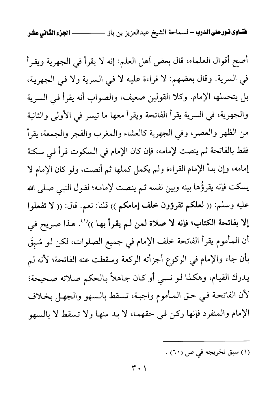 أصح أقوال العلماء، قال بعض أهل العلم: إنه لا يقرأ في الجهرية ويقرأ في السرية. وقال بعضهم: لا قراءة عليه لا في السرية ولا في الجهرية، بل يتحملها الإمام. وكلا القولين ضعيف، والصواب أنه يقرأ في السرية والجهرية، في السرية يقرأ الفاتحة ويقرأ معها ما تيسر في الأولى والثانية من الظهر والعصر، وفي الجهرية كالعشاء والمغرب والفجر والجمعة، يقرأ فقط بالفاتحة ثم ينصت لإمامه، فإن كان الإمام في السكوت قرأ في سكتة إمامه، وإن بدأ الإمام القراءة ولم يكمل كملها ثم أنصت، ولو كان الإمام لا يسكت فإنه يقرؤها بينه وبين نفسه ثم ينصت لإمامه؛ لقول النبي صلى الله عليه وسلم: «لعلكم تقرؤون خلف إمامكم» قلنا: نعم. قال: «لا تفعلوا إلا بفاتحة الكتاب؛ فإنه لا صلاة لمن لم يقرأ بها (¬1)» هذا صريح في أن المأموم يقرأ الفاتحة خلف الإمام في جميع الصلوات، لكن لو سبق بأن جاء والإمام في الركوع أجزأته الركعة وسقطت عنه الفاتحة؛ لأنه لم يدرك القيام، وهكذا لو نسي أو كان جاهلا بالحكم صلاته صحيحة؛ لأن الفاتحة في حق المأموم واجبة، تسقط بالسهو والجهل بخلاف الإمام والمنفرد فإنها ركن في حقهما، لا بد منها ولا تسقط لا بالسهو