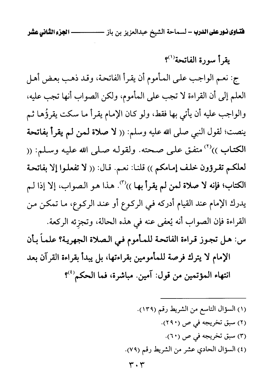 ج: نعم الواجب على المأموم أن يقرأ الفاتحة، وقد ذهب بعض أهل العلم إلى أن القراءة لا تجب على المأموم، ولكن الصواب أنها تجب عليه، والواجب عليه أن يأتي بها فقط، ولو كان الإمام يقرأ ما سكت يقرؤها ثم ينصت؛ لقول النبي صلى الله عليه وسلم: «لا صلاة لمن لم يقرأ بفاتحة الكتاب (¬2)» متفق على صحته. ولقوله صلى الله عليه وسلم: «لعلكم تقرؤون خلف إمامكم» قلنا: نعم. قال: «لا تفعلوا إلا بفاتحة الكتاب؛ فإنه لا صلاة لمن لم يقرأ بها (¬3)» هذا هو الصواب، إلا إذا لم يدرك الإمام عند القيام أدركه في الركوع أو عند الركوع، ما تمكن من القراءة فإن الصواب أنه يعفى عنه في هذه الحالة، وتجزئه الركعة.