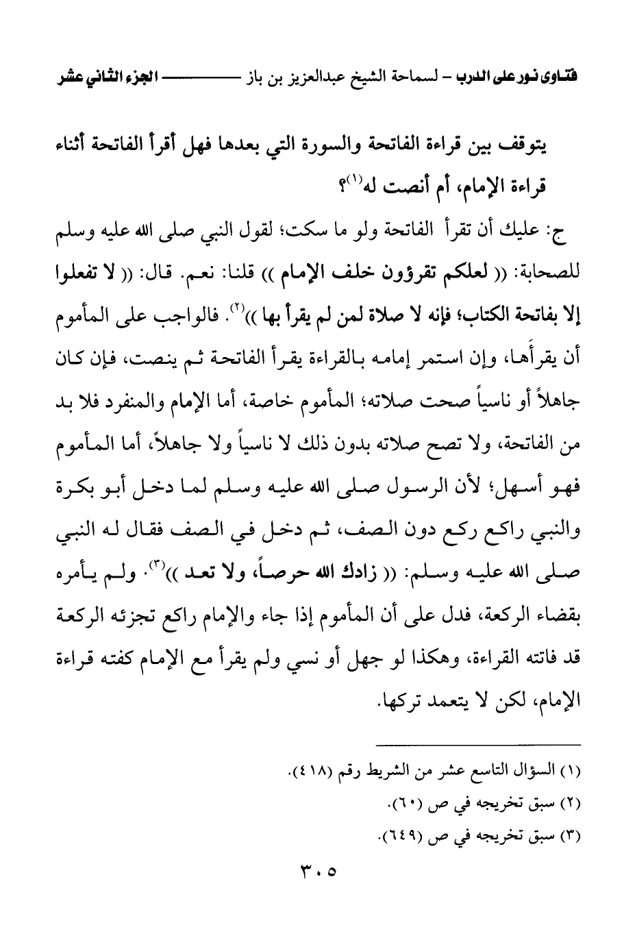 ج: عليك أن تقرأ الفاتحة ولو ما سكت؛ لقول النبي صلى الله عليه وسلم للصحابة: «لعلكم تقرؤون خلف الإمام» قلنا: نعم. قال: «لا تفعلوا إلا بفاتحة الكتاب؛ فإنه لا صلاة لمن لم يقرأ بها (¬2)» فالواجب على المأموم أن يقرأها، وإن استمر إمامه بالقراءة يقرأ الفاتحة ثم ينصت، فإن كان جاهلا أو ناسيا صحت صلاته؛ المأموم خاصة، أما الإمام والمنفرد فلا بد من الفاتحة، ولا تصح صلاته بدون ذلك لا ناسيا ولا جاهلا، أما المأموم فهو أسهل؛ لأن الرسول صلى الله عليه وسلم لما دخل أبو بكرة والنبي راكع ركع دون الصف، ثم دخل في الصف، فقال له النبي صلى الله عليه وسلم: «زادك الله حرصا، ولا تعد (¬3)» ولم يأمره بقضاء الركعة، فدل على أن المأموم إذا جاء والإمام راكع تجزئه الركعة قد فاتته القراءة، وهكذا لو جهل أو نسي ولم يقرأ مع الإمام كفته قراءة الإمام، لكن لا يتعمد تركها.