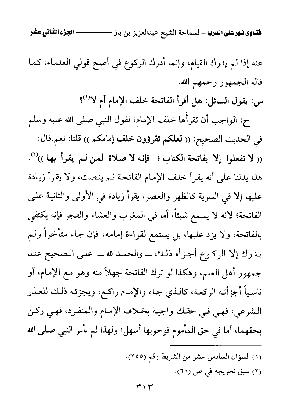 ج: الواجب أن تقرأها خلف الإمام؛ لقول النبي صلى الله عليه وسلم في الحديث الصحيح: «لعلكم تقرؤون خلف إمامكم» قلنا: نعم. قال: «لا تفعلوا إلا بفاتحة الكتاب؛ فإنه لا صلاة لمن لم يقرأ بها (¬2)» هذا يدلنا على أنه يقرأ خلف الإمام الفاتحة ثم ينصت، ولا يقرأ زيادة عليها إلا في السرية كالظهر والعصر، يقرأ زيادة في الأولى والثانية على الفاتحة؛ لأنه لا يسمع شيئا، أما في المغرب والعشاء والفجر فإنه يكتفي بالفاتحة، ولا يزد عليها، بل يستمع لقراءة إمامه، فإن جاء متأخرا ولم يدرك إلا الركوع أجزأه ذلك - والحمد لله - على الصحيح عند جمهور أهل العلم، وهكذا لو ترك الفاتحة جهلا منه وهو مع الإمام، أو ناسيا أجزأته الركعة، كالذي جاء والإمام راكع، ويجزئه ذلك للعذر الشرعي، فهي في حقك واجبة بخلاف الإمام والمنفرد، فهي ركن بحقهما، أما في حق المأموم فوجوبها أسهل؛ ولهذا لم يأمر النبي صلى الله